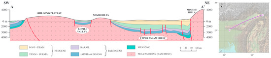 Schematic geological section across the Shillong–Mikir Plateaus and the Assam Valley, adapted from [26,27]. Red lines indicate faults.