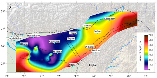 Depth to the top of the basement in the study area, as estimated from RF analysis, adapted from Saikia et al. [12]. Major tectonic lines are taken from Figure 3.
