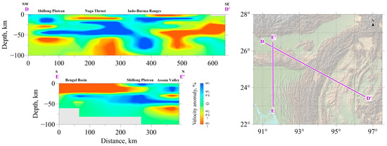 P-wave tomography conducted by Mishra [138] using a comparatively limited dataset revealed smooth velocity distributions in the NE India and Indo-Burma regions (Figure 9). Vp anomalies showed a strong correlation with the region’s collision and subduction tectonics. High-velocity zones indicated the underthrusting of the Indian plate beneath the Indo-Burmese Arc, while low-velocity zones were linked to thick Bengal Basin sediments, potentially underthrusting beneath the Shillong Plateau. Additionally, low-Vp zones were identified in the upper crust along the Dudhnoi, Chedrang, and Kopili faults, as well as the Barapani shear zone.