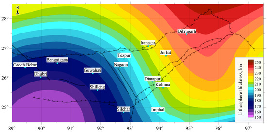 However, Devi et al. [137] identified the lithosphere–asthenosphere boundary (LAB) at a depth of 90 km beneath the Shillong Plateau, deepening to 135 km on either side, suggesting a lithospheric upwarp related to the plateau’s uplift. They also observed that the lithosphere thickens further north, reaching ~180 km beneath the Eastern Himalaya. Kumar et al. [142] found a highly variable LAB depth across the region, with depths of 135 km beneath the Shillong Plateau, increasing to 160 km in the Bhutan Himalaya, and decreasing to ~75 km in the Central Assam Valley. Priestley and McKenzie [143], through surface wave tomography, revealed smoother lithospheric thickness variations, with the thickness ~160 km beneath the Shillong Plateau, increasing northeastward to 240 km in the Assam Syntaxis (Figure 10). In contrast, the global LITHO1.0 model [144] presents a patchy picture of the region, indicating a ~200 km thick lithosphere beneath the central Shillong Plateau, which decreases sharply to ~60 km within the Upper Assam Valley.
