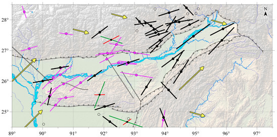 Shear wave splitting results, adapted from Kanaujia and Surve [155]. The red bars denote the fast polarization directions and delay times for the upper anisotropic layer, while the green bars indicate these parameters for the lower anisotropic layer. Estimates for single-layer anisotropy [155] are represented by black bars. Pink bars represent results from [149,157]. Hollow circles represent stations with absence of detectable splitting. Yellow arrows show the absolute plate motion directions within a no-net-rotation reference frame [158].