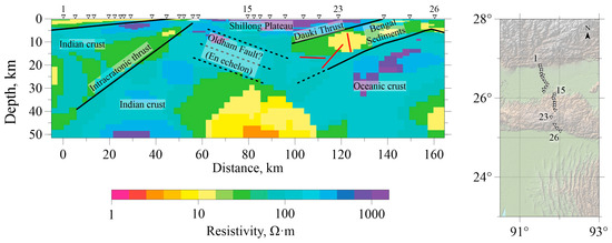 Gokarn et al. [86] conducted MT soundings along a north–south profile across the Shillong Plateau and Assam Valley. Their 2D inversion results [86,174], extending to depths of 50 km, identified the Dauki fault as an NE-SW thrust zone with a dip of ~30° (Figure 12). This zone was associated with the subduction of low-resistivity Bengal sediments and underlying oceanic crust. In the Assam Valley, a parallel thrust zone, corresponding to the Brahmaputra Fault, was interpreted as an intracratonic thrust within the Indian plate. The study suggests that the Shillong Plateau and adjacent sedimentary layers act as a supracrustal block, not directly involved in the subduction process. Additionally, the findings indicate that the NE Indian crust responds differently to compressive forces at various depths, influenced by rheological factors. The study conclusions are supported by subsequent passive seismic studies [122,123,130] and gravity modeling [43].