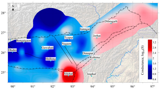 - Gokarn, S.G.; Gupta, G.; Walia, D.; Sanabam, S.S.; Hazarika, N. Deep Geoelectric Structure over the Lower Brahmaputra Valley and Shillong Plateau, NE India Using Magnetotellurics. Geophys. J. Int. 2008, 173, 92–104. [Google Scholar] [CrossRef]