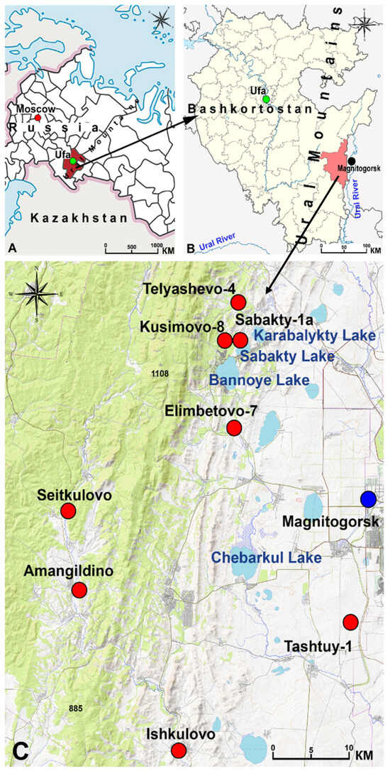 Study area location: (A)—Baskortostan Republic in Russia, (B)—Abzelilovskiy district within Bashkortostan, (C)—locations of the sites studied in the region around Magnitogorsk (https://opentopomap.org/#map=12/53.6136/58.6776, accessed on 3 January 2024).