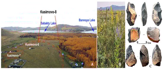 (A) Locations of Kusimovo-8, 6, and 7 sites. Quadcopter view. Photo by A.A. Khurmaev, 2021, (B) landscape near the Kusimovo and Sabakty-1a; sites. (C) three Paleolithic stone tools in different angles from the Kusimovo-8 site.—one stone tool in different angles.