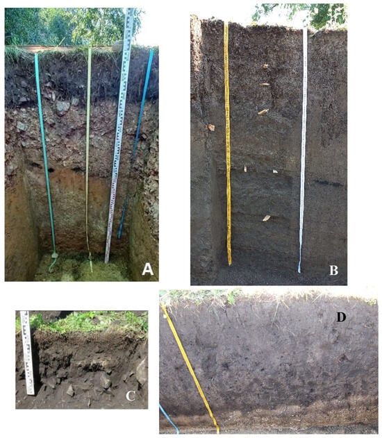 Pedological and archeological studies were conducted on eight settlements of differing ages in the Abzelilovsky district of the Republic of Bashkortostan near the southern Trans-Ural Mountains in Russia (Table 1, Figure 1). The dates of those settlements range from the Paleolithic to the Late Medieval and Modern Ages. The sites are located mainly on the terraces of small rivers in the Ural River basin and are used as pastures with moderate grazing. The altitude above sea level is 400–600 m. The region is in the mountain-steppe, mountain-forest-steppe, and steppe zones of the southern Trans-Urals. The geology of the region is dominated by Devonian rocks, with Quaternary alluvial deposits overlying them in places. In the foothill part, volcanogenic rocks are represented, in particular, diabase rocks. Forests occupy roughly half of the area. Pine and birch-larch forests and virgin mixed grass associations are widespread and mostly plowed. The average regional annual air temperature is 1.4 °C, and the average temperature is +17.6 °C in July and −15.5 °C in January. Lowland areas receive 350–400 mm of precipitation per year; mountainous areas receive 550 mm [32,33]. A large metallurgical plant is located at Magnitogorsk, 18–60 km from the study sites. The CLs developed mainly on Chernozems, Luvic—frequently, Haplic, and, less commonly (Tashtui-1), Mollic Leptosol Eutric—on diabase (Amangildino) and fluvial soil at the Ishkulovo site (Figure 2). In all the CLs studied, pottery fragments and animal bones were the most common finds, while stone tools were found at the Elimbetovo, Kusimovo-8, and Sabakty-1a sites.