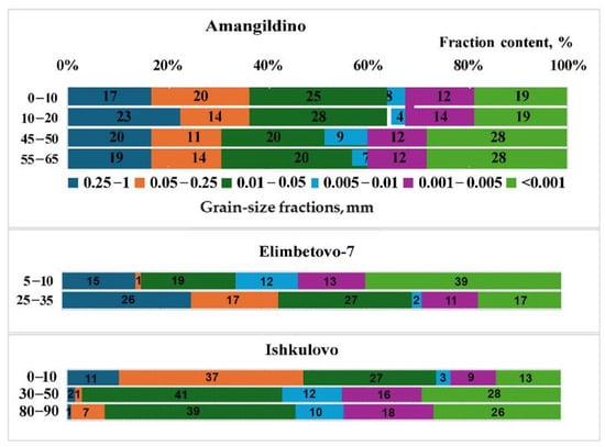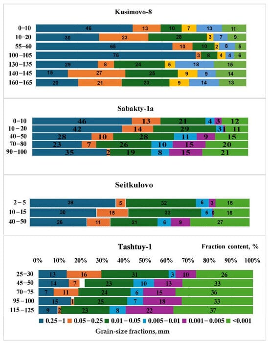Most of the CLs examined have medium to heavy loamy granulometric composition and contain fractions with a diameter of <0.01 mm (38–56%) and sandy fractions of 1–0.25 mm (less than 20%) (Figure 4). At the Kusimovo-8, Sabakty-1a, and Seytkulovo sites, the upper parts of the profiles are sandy loam with fractions of <0.01 mm 14–20%, and the lower parts are medium loamy (32–45%). In the CLs profiles, a pH value close to neutral was mainly recorded; only in the Tashtui-1 settlement was an alkaline reaction (below 30 cm) observed (Figure 5). Soil and CL profiles are not salinized, with the amount of easily soluble salts at less than 0.1% (Table 1). The exchange complex (= cation exchange capacity) is saturated with calcium up to 74–96% of the total absorbed cations.
