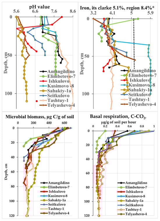 pH, iron, microbial biomass, and basal respiration of the sites. * In all figures, dashed line means the Clarke value, region—regional elements content accordion (8).