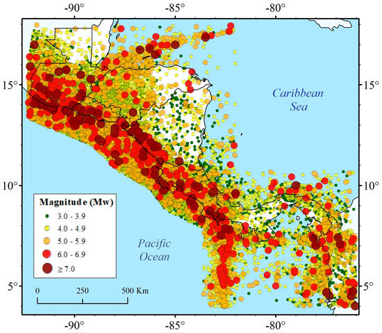 We used the updated regional earthquake catalog of Central America generated from 14 databases of local and regional seismic networks as part of the results of the KUK-AHPÁN project. This earthquake catalog comprises 260 548 seismic events ranging from Mw 1.0 to 7.9 and of depths up to 300 km in the period from 1520 to 2020 [16]. Figure 2 shows the seismicity map used in this study derived from the regional earthquake catalog for seismic events of more than Mw 3.0.
