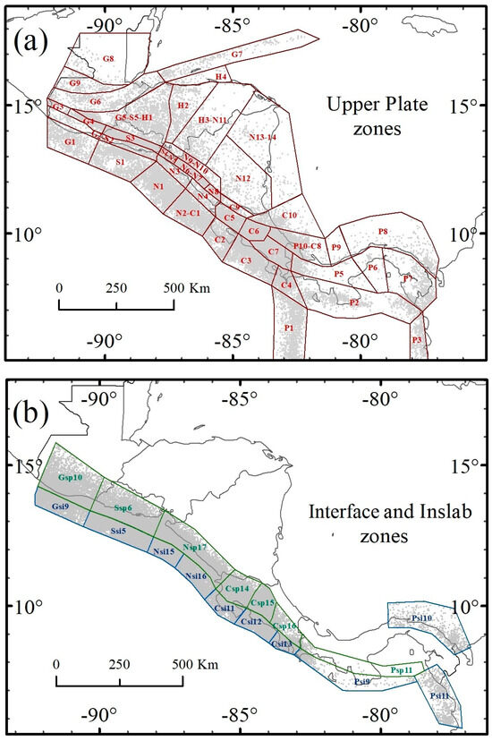 Seismic zones for Central America proposed by Alvarado et al. (2017) [12] for the (a) upper plate zones (red color), (b) interface zones (blue color), and inslab zones (green color). Gray dots represent the spatial distribution of seismicity within each seismic zone.