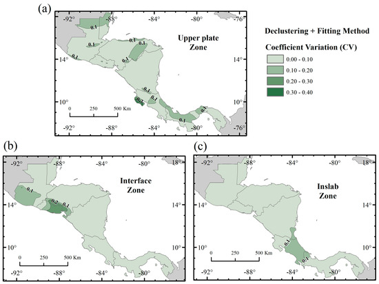 A similar situation occurs in the Forearc zone of Costa Rica (C2) and the interface zone of El Salvador (Ssi5). Despite their high activity due to their location in the subduction zone, the declustering method tended to remove a significant proportion of their small events, leading to a reduction in the b-value in the processed catalog [35,37]. This reduction pattern in the b-value introduced a deviation in the recurrence rate, resulting in variability in the calculated accelerations, and, ultimately, increasing the CV for these zones.