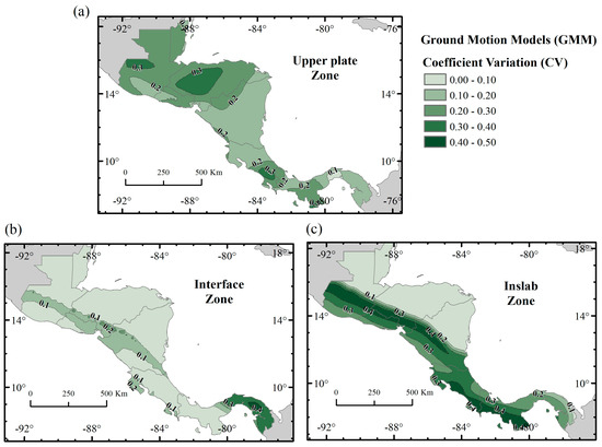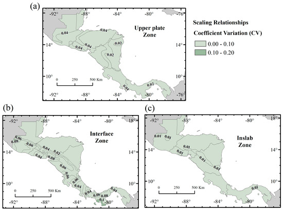 For this study, we focused on scaling relationships using the rupture area (A). For the upper plate regime, we followed the logic tree proposal by Arroyo-Solórzano et al. (2024) [52] and compared the Mmax values given by the scaling relationships from their study with those of Thingbaijam et al. (2017) [53] and Papazachos et al. (2004) [54]. For the interface regime, we compared the results with the relationships proposed by Wells and Coppersmith (1994) [55], Strasser et al. (2010) [56], Allen and Hayes (2017) [57], and Thingbaijam et al. (2017) [53]. Finally, for the inslab regime, we compared only those proposed by Strasser et al. (2010) [56] and Allen and Hayes (2017) [57]. The comparison among the hazard results using different scaling relationships for each tectonic regime was conducted using the coefficient of variation (CV) to assess their spatial variability and whether the application of these relationships significantly affects the accelerations generated across the territory of CA. Figure 5 shows the CV maps for each tectonic regime.
