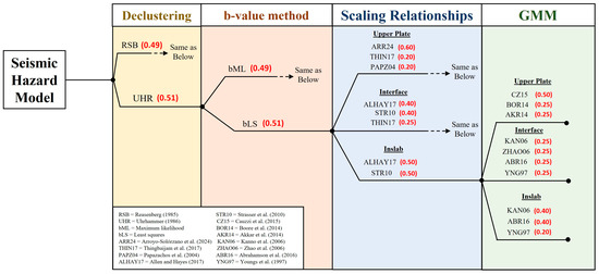 Gurjar and Basu (2022) [2] established that the weights for the logic tree are inversely proportional to the mean squared error (MSE) of all analyzed seismic zones. To achieve this, the MSEs of all seismic zones were plotted according to the declustering method and the fitting method used in the recurrence models. Subsequently, the errors were fitted to a line from the origin, and finally, the equations by Gurjar and Basu (2022) [2] were applied to assign the weights in the logic tree. For more details, refer to the Supplementary Materials that accompany this article.