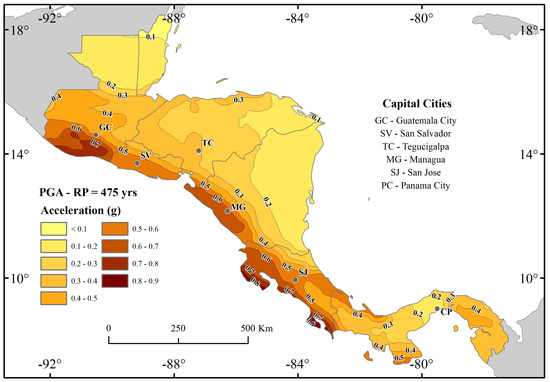 Based on the proposed logic tree, a seismic hazard map for Central America was generated in the form of a spectral ordinate of PGA for return periods of 475 years. For this purpose, we used the OpenQuake program from the Global Earthquake Model (GEM) to conduct seismic hazard calculations [46,47]. The hazard map is shown in Figure 10.