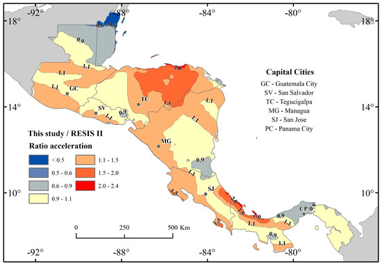 Map showing the ratio of acceleration in this study and the RESIS II project [3].