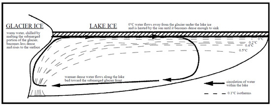 Direct glacial melt by the lake waters of a paleolake in Taylor Valley may also have played a role in sustaining the lake. Hendy et al. [17] propose an ‘inverted convection cycle’ as a mechanism for meltwater formation in locations where lake waters are in direct contact with glacial ice (Figure 2). Near-freezing lake waters at the top of the water column are heated by solar radiation penetrating the lake ice cover, causing the density of this lake water to increase (since maximum density of water is at 4 °C). This relatively warm, denser water sinks toward the bottom of the lake. Meanwhile, along the glacial front, cold (below 4 °C), less dense waters rise, pulling the warmer, sinking waters toward the glacier face. This warmer water causes melting along the glacial front, causing the water to cool down, become less dense, and rise. This allows the cycle to repeat and, causing lake waters to undercut the glacier front beneath the surface.