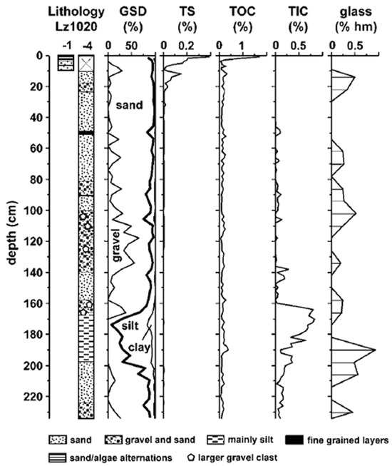 Lake Hoare sediment core log. GSD = Grain Size Distribution, TS = Total Sulfur, TOC = Total Organic Carbon, TIC = Total Inorganic Carbon, and glass refers to volcanic glass associated with the Ross Sea Drift (modified from source [67]).