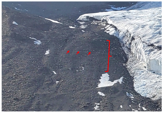 Delicate type strandlines (left of the red bracket) next to Rhone Glacier. The red arrows point to the most prominent of these linear features. Photo credit M. Stone.