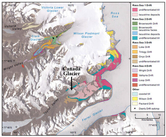 - Bockheim, J.G.; Prentice, M.L.; McLeod, M. Distribution of glacial deposits, soils, and permafrost in Taylor Valley, Antarctica. Arct. Antarct. Alp. Res. 2008, 40, 279–286. [Google Scholar] [CrossRef]