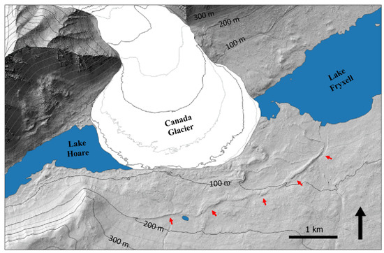 The strandline study of Jones et al. [78] is significant as it is the only data-driven study of strandline formation in the MDVs known to the authors. Thus, ice-push type strandlines are the only strandline type identified in the region that are confirmed to be of lacustrine origin. Ice-push type strandlines are notably absent above Lakes Bonney and at higher elevations above Lake Fryxell in Taylor Valley [18], though some ice-push strandlines have been noted along the lakeshore of Lake Fryxell within a few vertical meters of its modern lake level (e.g., [73]), and signatures of buried ice-push strandlines were not identified in a Bonney Basin survey of soils above and below the proposed GLW highstand level of 336 m asl [19].