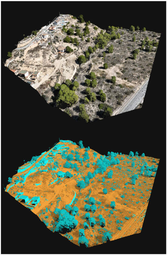 Following point cloud generation, classification was performed to isolate ground points necessary for accurate terrain modeling (Figure 3). Point cloud filtering was conducted using Pix4D Survey, employing a combination of manual editing and semi-automatic methods. This included the application of terrain classification algorithms such as cloth simulation filtering and multiscale curvature-based classification, widely recognized for producing reliable bare-earth DTMs in complex or vegetated terrain [45].