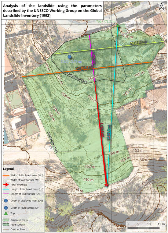 These parameters confirm that the Bella Orxeta event fits within the lower size categories defined by Cruden and Varnes but with clear deformation features typical of rotational mass movements. This quantitative framework allows for meaningful comparison with other regional or international case studies and supports further classification and hazard assessment work.