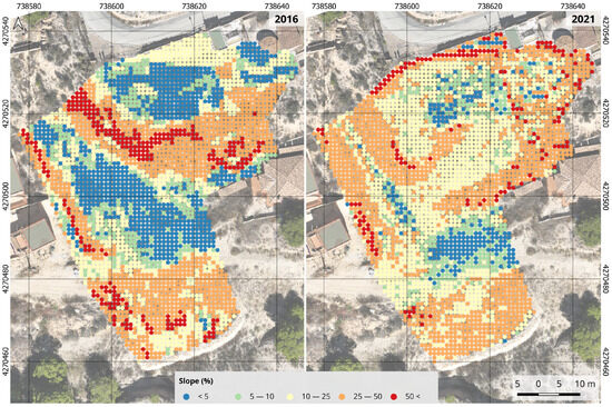 Volumetric analysis was conducted by differencing DTMs from sequential time steps (e.g., 2016 vs. 2023). For consistency, all point clouds were interpolated into Digital Elevation Models (DEMs) using a Triangulated Irregular Network (TIN) method. The photogrammetric data from the 2021 and 2023 UAV flights were processed at a resolution of 3 cm/pixel, reflecting the native resolution of the imagery. Although the LiDAR-derived point cloud did not support such high spatial density, it was interpolated at the same resolution to match the photogrammetric datasets and allow direct comparison. Slope and aspect metrics were subsequently derived from a generalized 5-m resolution DEM to reduce local noise and facilitate broader terrain analysis. This alignment ensured pixel-level correspondence across datasets, which is critical for cell-by-cell elevation change analysis [49,50].
