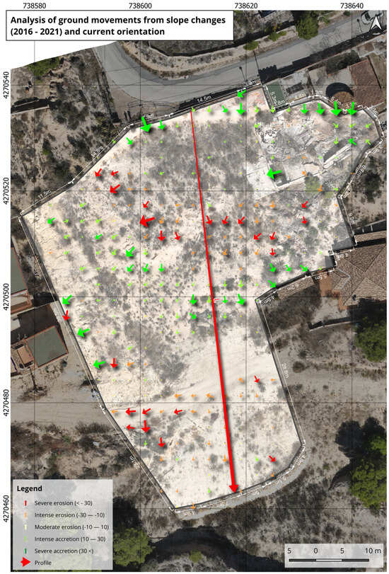 The analysis of multitemporal digital terrain models (DTMs) reveals substantial morphological changes in the Bella Orxeta slope between 2016 and 2021, corresponding to the main landslide event, followed by more localized surface reshaping between 2021 and 2023. These changes were assessed through shaded relief models, orthomosaics, and DTM differencing, all referenced to the 2016 LiDAR-based DTM.