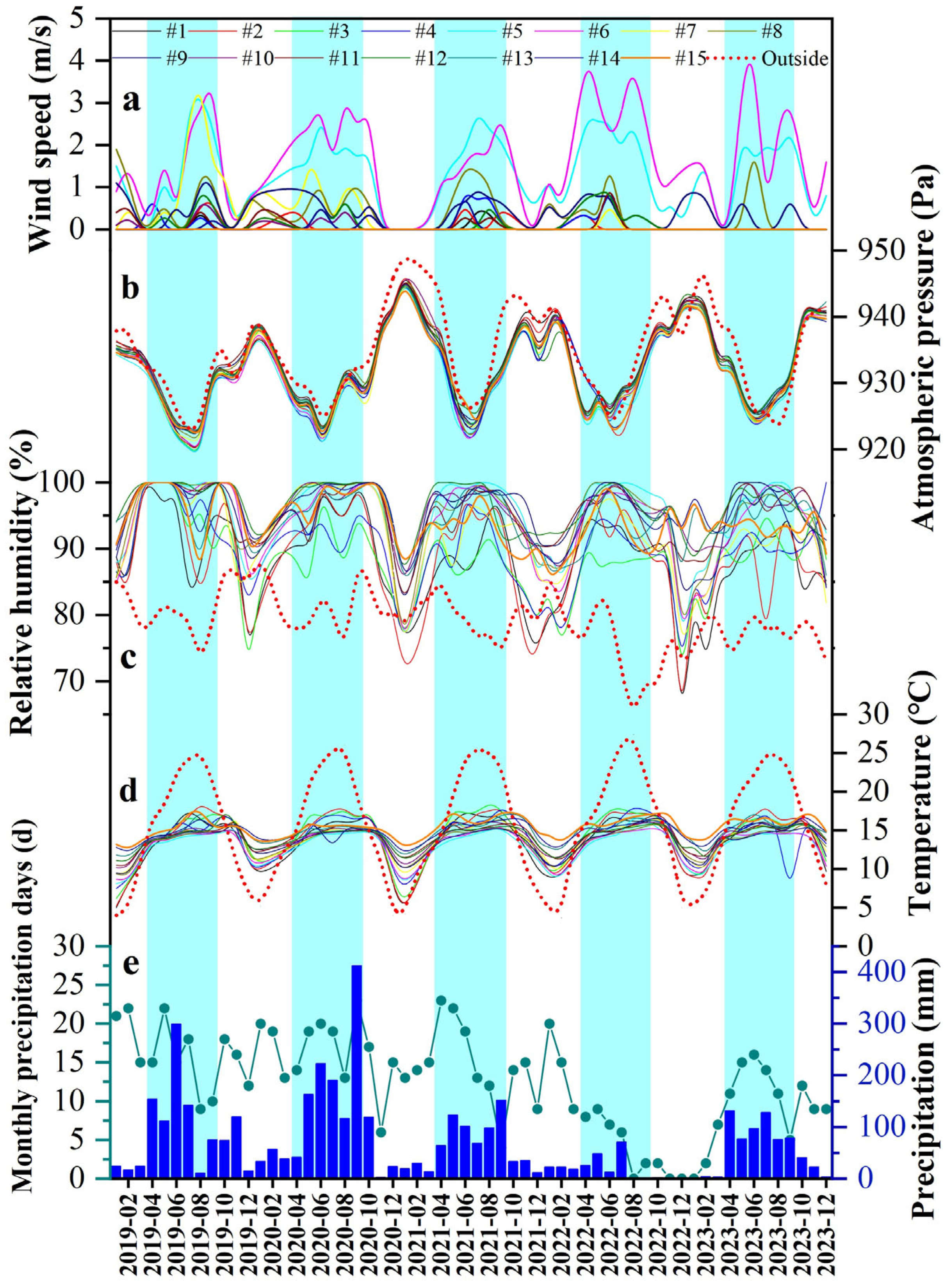 - Ban, F.; Li, X.; Meng, H.; Zhang, R.; Chen, F.; Li, T.; Li, J.; Liu, W.; Dong, R.; Wu, R. Variation in Cave Air Temperature and Humidity and Their Driving Mechanisms in Shihua Cave, Beijing. Acta Geogr. Sin. 2024, 79, 2312–2323. [Google Scholar] [CrossRef]