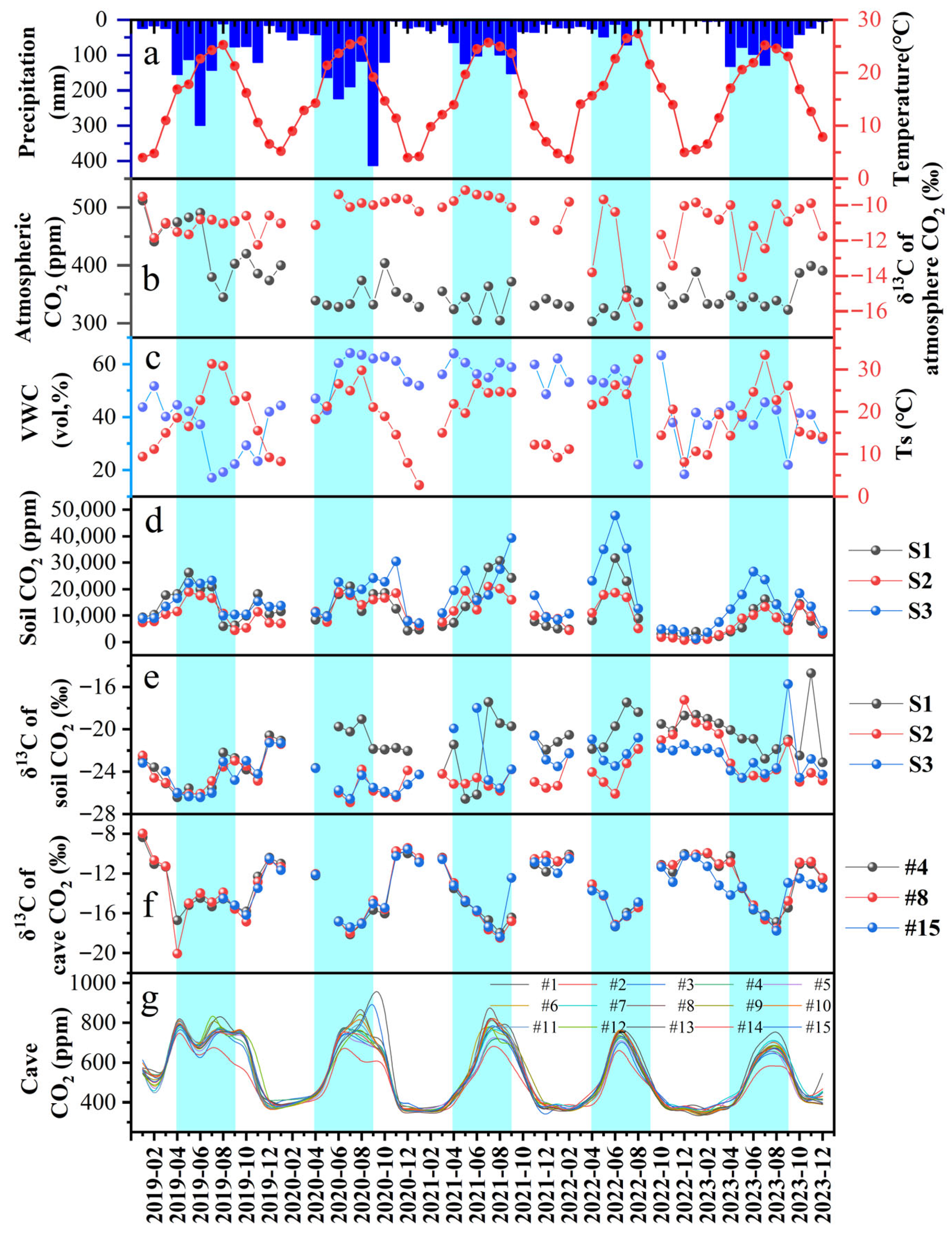 - Abnormally high cave CO2 values (negative δ13C) in April 2019: The average cave CO2 value of all monitoring sites in April 2019 was 863 ppm, which was almost twice the value of the same period from 2020 to 2023 (417, 425, 413, and 382 ppm, respectively) (Figure 3g). Correspondingly, the average value of soil CO2 (S, 40 cm) was as high as 18,231 ppm in April 2019, while it was only 12,123 ppm in the same period of the other four years (Figure 3d). This was due to the precipitation bias of 154.4 mm (cave δ13C-CO2 value of −18.38‰) in April 2019, compared to the average precipitation value of 65.9 mm (cave δ13C-CO2 value of −12.59‰) in the same period from 2020 to 2023 (Figure 3a,f). This shows that precipitation is one of the main factors affecting soil CO2 yield, cave CO2, and its δ13C changes on the interannual scale [71], and a study in Furong Cave, China, also found that precipitation affects soil CO2 more than temperature on the interannual scale [17].