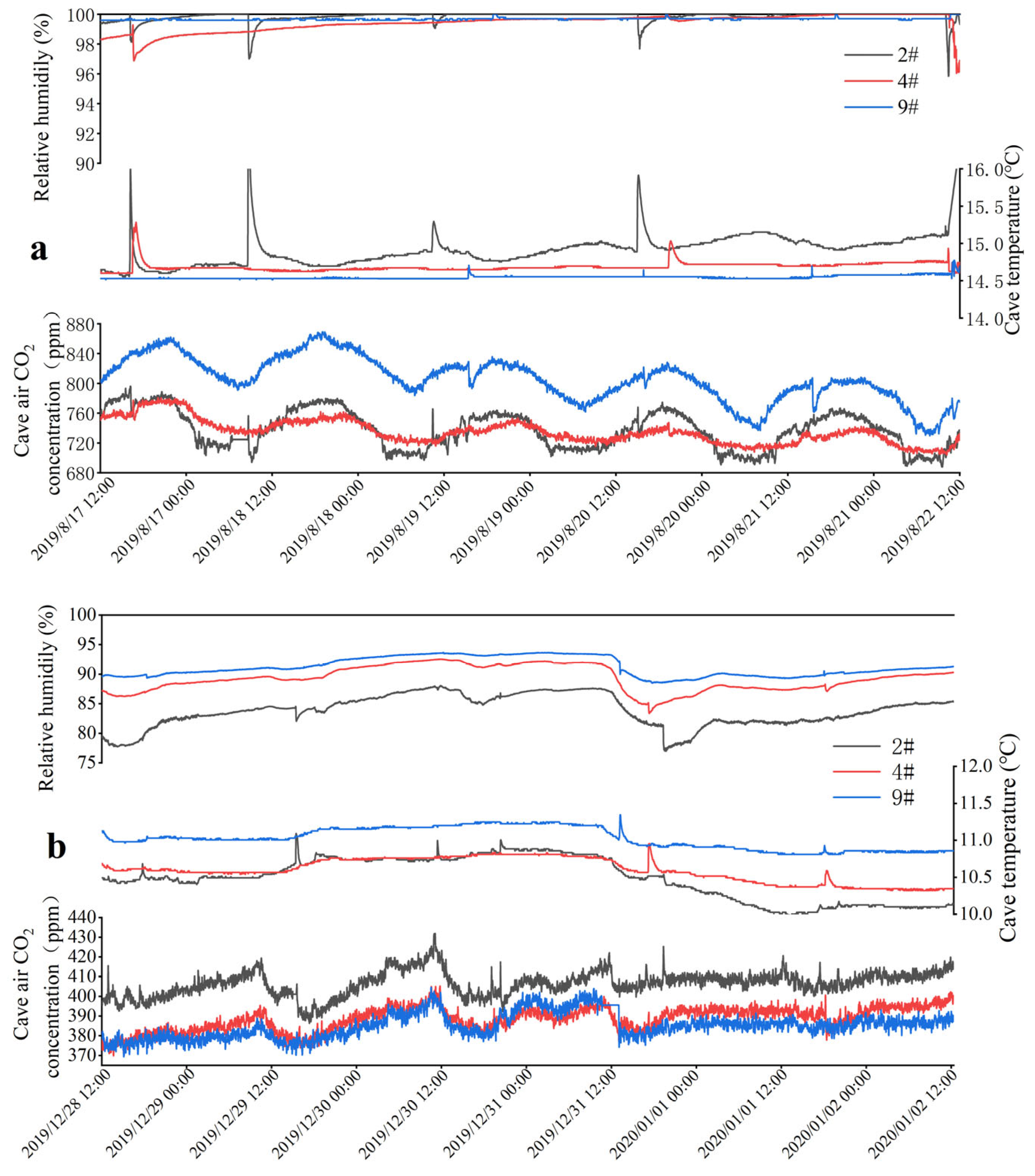- Li, J.Y.; Li, T.Y. Seasonal and Annual Changes in Soil/Cave Air pCO2 and the δ13CDIC of Cave Drip Water in Response to Changes in Temperature and Rainfall. Appl. Geochem. 2018, 93, 94–101. [Google Scholar] [CrossRef]
