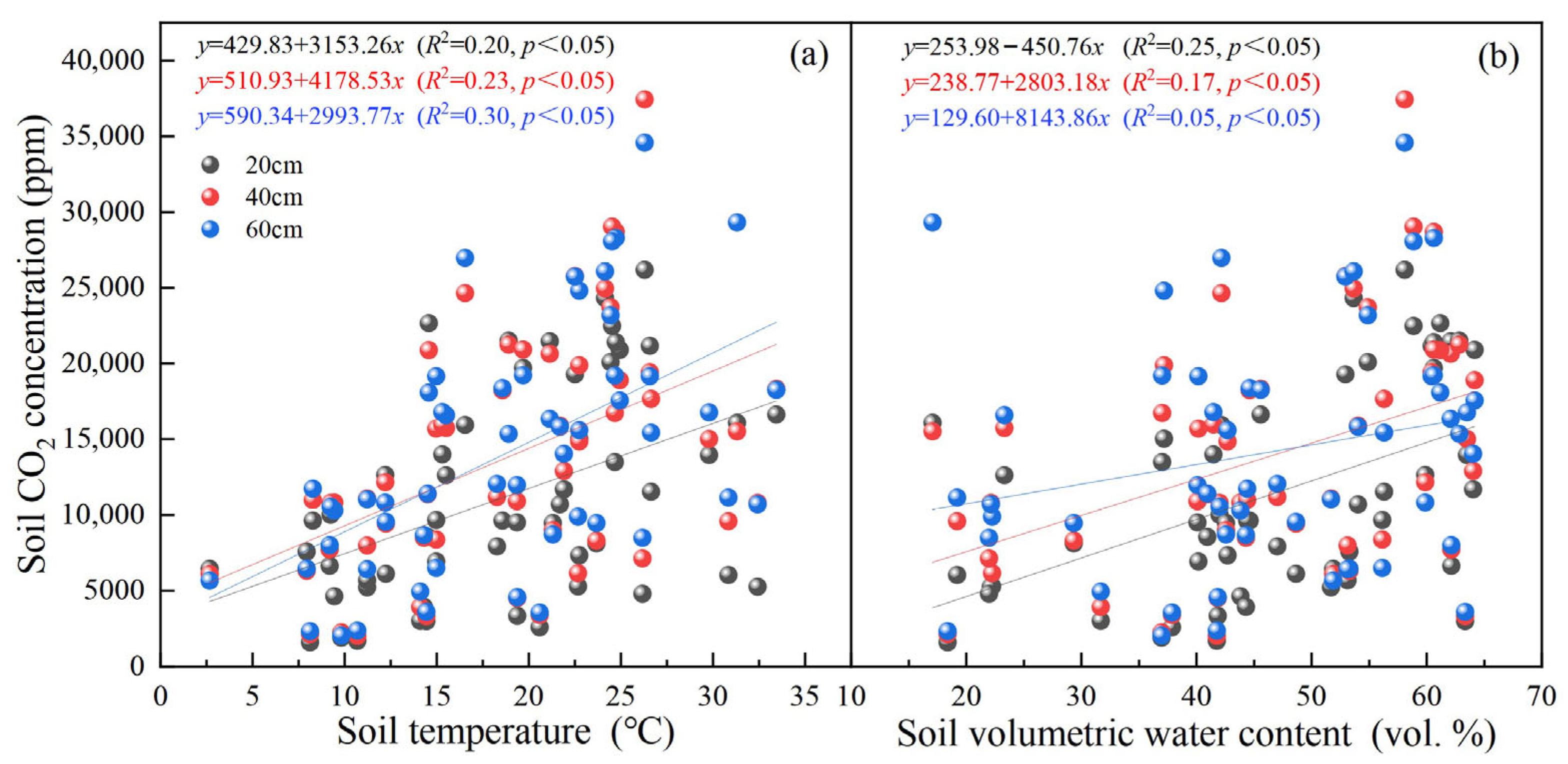 - Relationship between Ts and CO2 concentration in soil layers at different depths (Figure 5a): A significant positive correlation was observed between Ts and CO2 concentration in the 20–40–60 cm soil profile, and the correlation slightly increased with increasing soil depth (R2 = 0.20, 0.23, 0.30, respectively). Field observations showed that the mean values of soil CO2 in the 20–40–60 cm profiles were 11,250, 13,803, and 14,115 ppm, respectively, which is consistent with the soil CO2 gas diffusion model, that is, the soil CO2 content gradually increased with increasing depth [42]. Surface Ts is affected by several factors and is more likely to change with atmospheric temperature than deeper soils, while deeper soils are more stable in temperature change relative to the surface layer owing to the combined effects of delayed heat transfer, permeability, biological activities, and own thermal insulation of soil. In addition, as soil depth increases, porosity is reduced, gas diffusion rates decline, and CO2 concentrations become more stable.