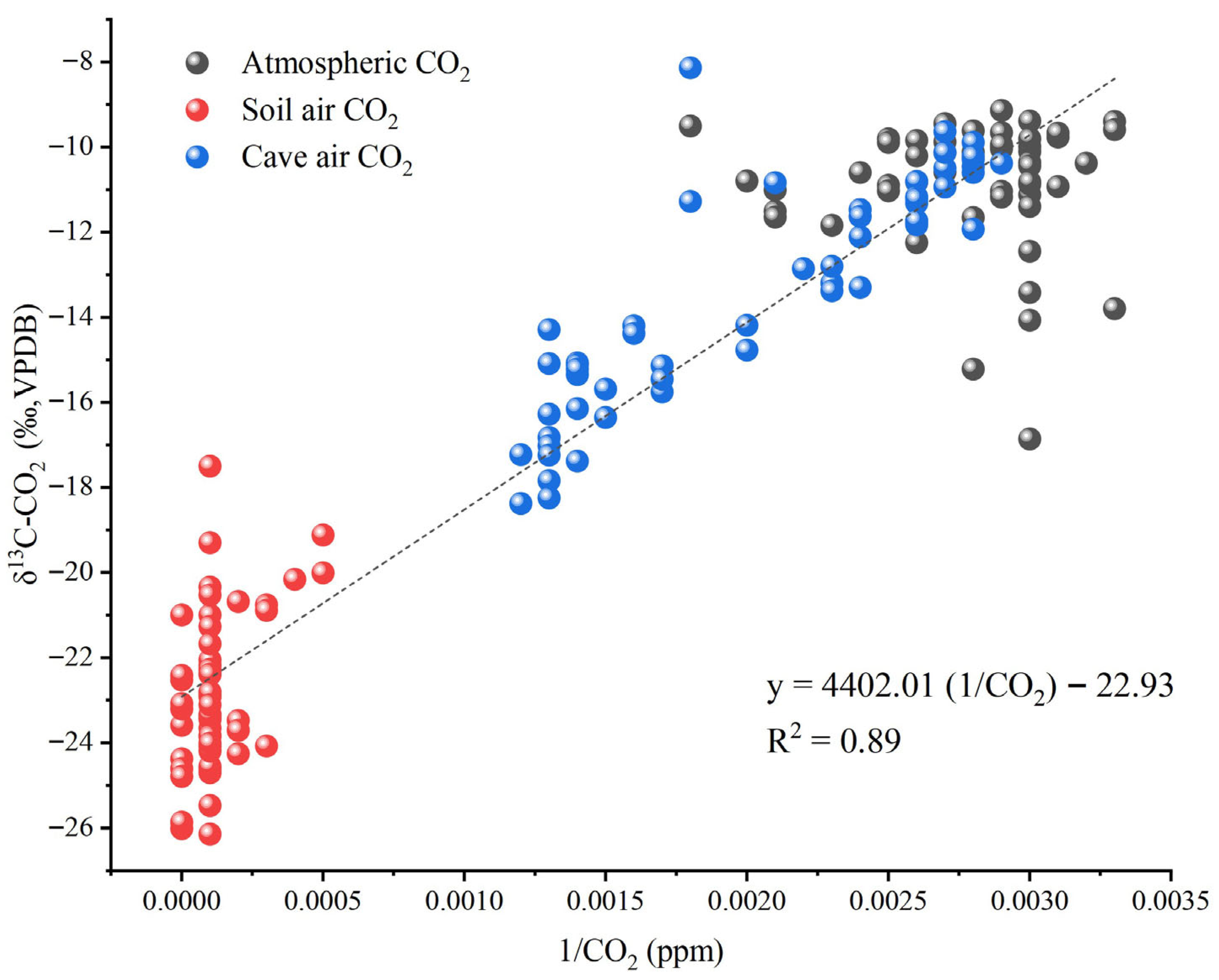 4.2.3. Cave Air CO2 Concentrations and Its δ13C Values