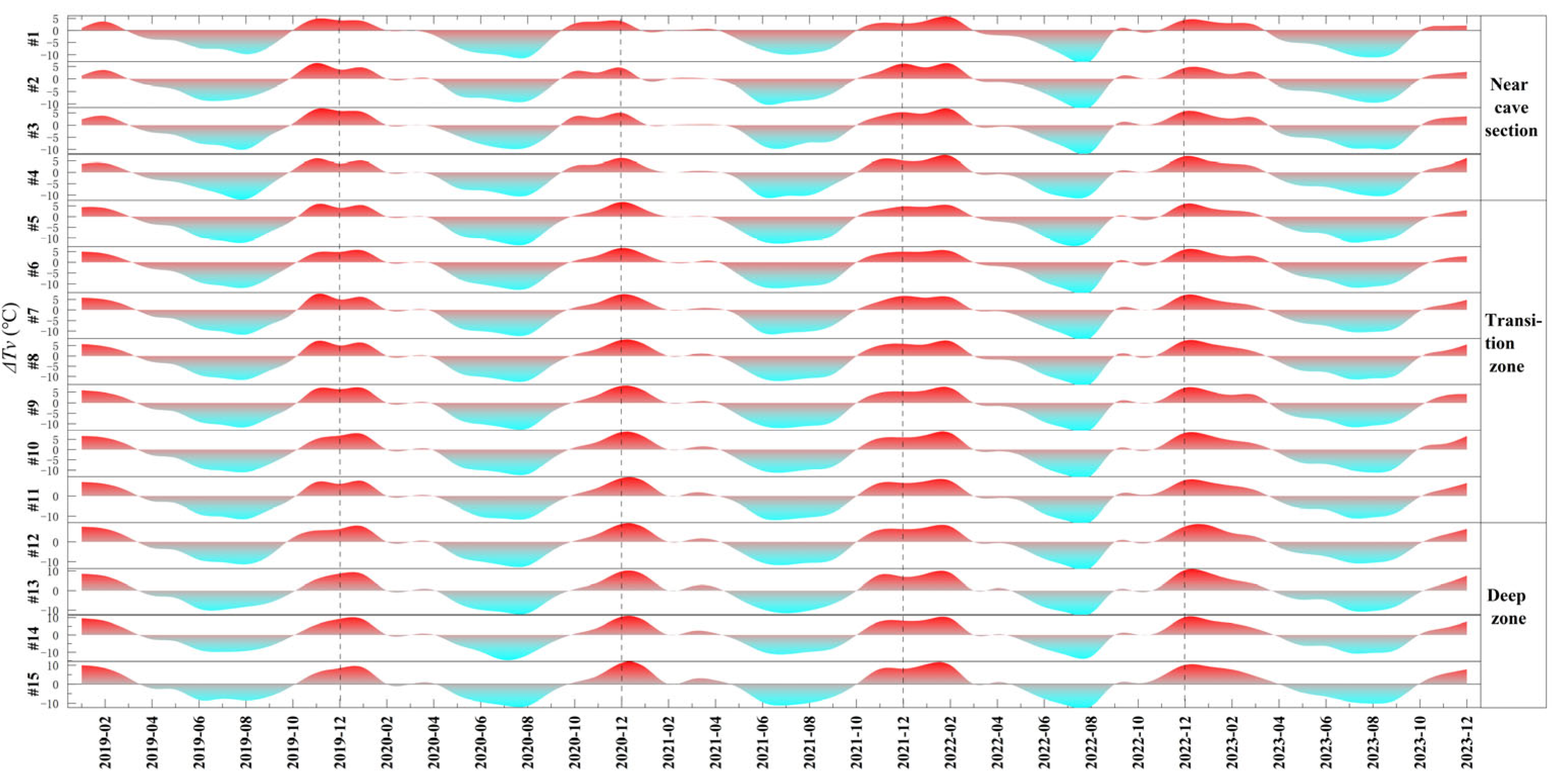 - A significant abrupt decrease in cave CO2 levels was observed in November: The cave CO2 concentration showed a relative decrease of 29.8% from October (563 ppm) to November (395 ppm), which is close to the atmospheric CO2 level outside the cave (winter average value of 409 ppm) (Figure 3g). This was attributed to the decrease in air and soil temperatures outside the cave in November, weakening of soil respiration, decrease in CO2 release, decrease in precipitation and soil moisture, increase in diffusion capacity of CO2 in the soil, and escape of more CO2 to the atmosphere instead of through the fissures into the cave [70]. From October to November, the average virtual temperature difference increased from 0.1 to 3.6 °C (Figure 10), enhanced ventilation introduced cold external air, which displaced and diluted the high CO2 concentration in the cave, resulting in a rapid decline.