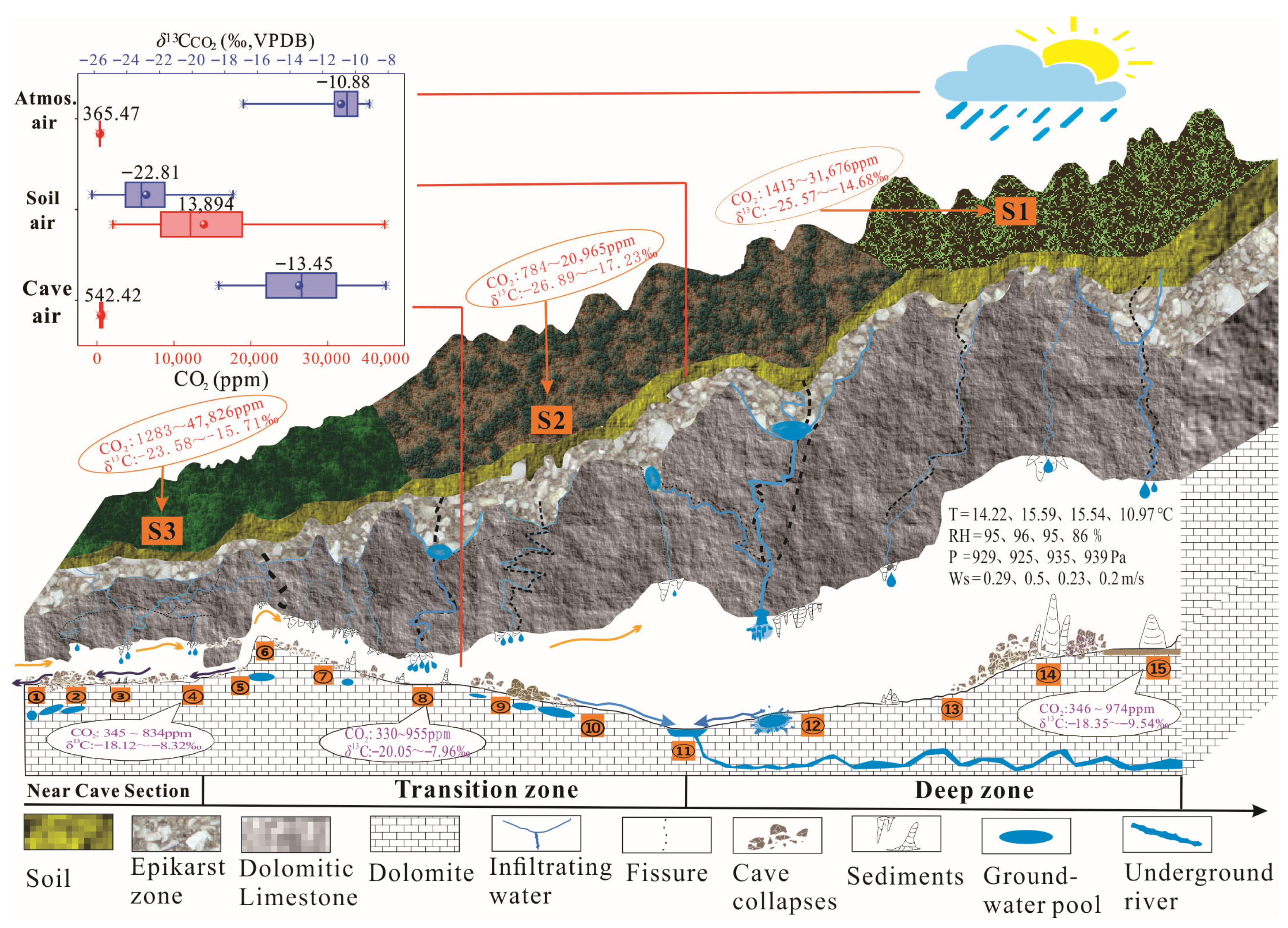 - Ding, M.; Wu, X.; Cao, J.; Hu, X.; Pan, M.; Huang, F.; Ren, M. Characteristics and Influencing Factors of Vertical Carbon Migration in the Cave System of Liangfeng Cave in Guilin. Carsologica Sin. 2021, 40, 600–607. [Google Scholar]