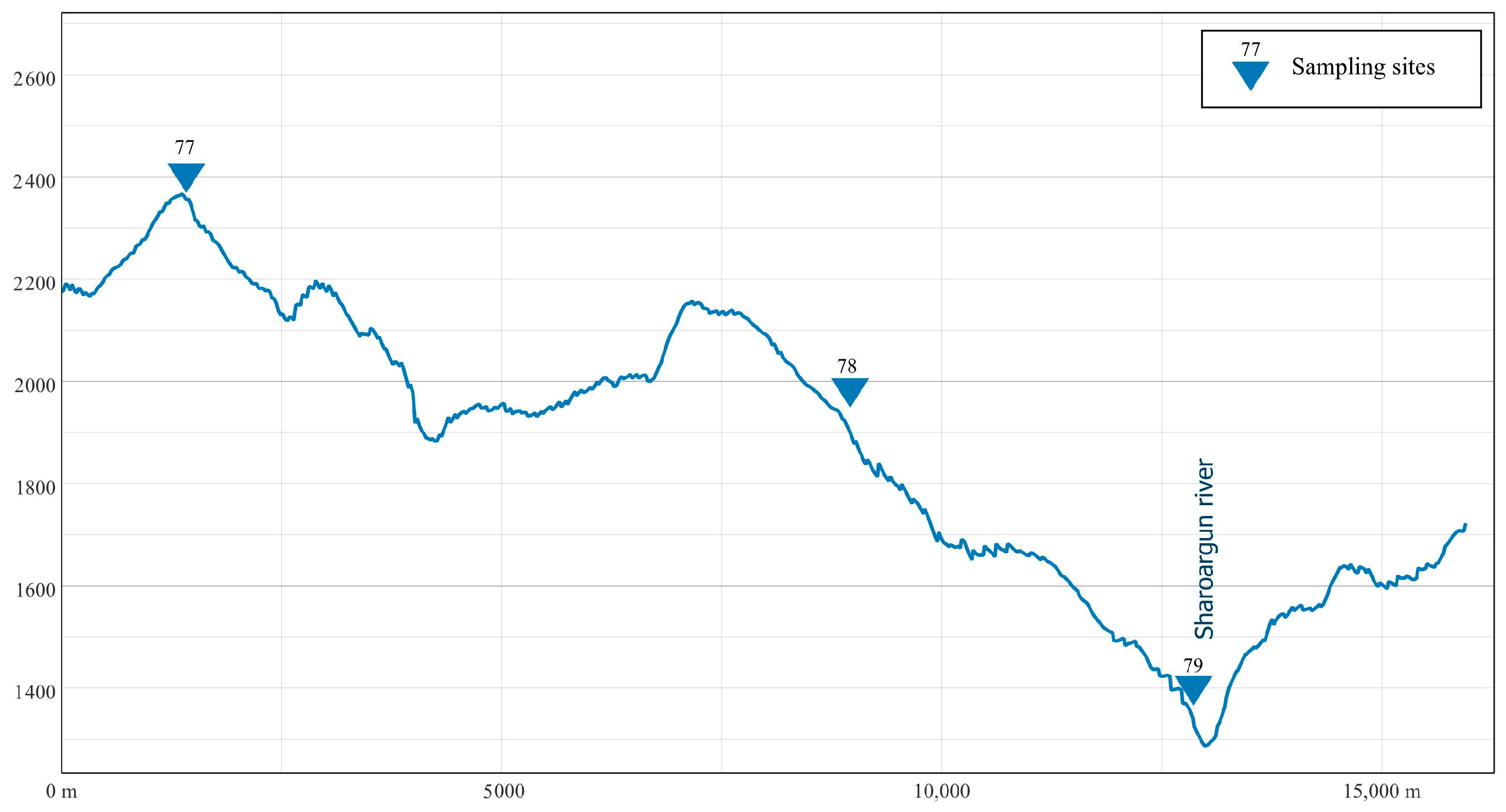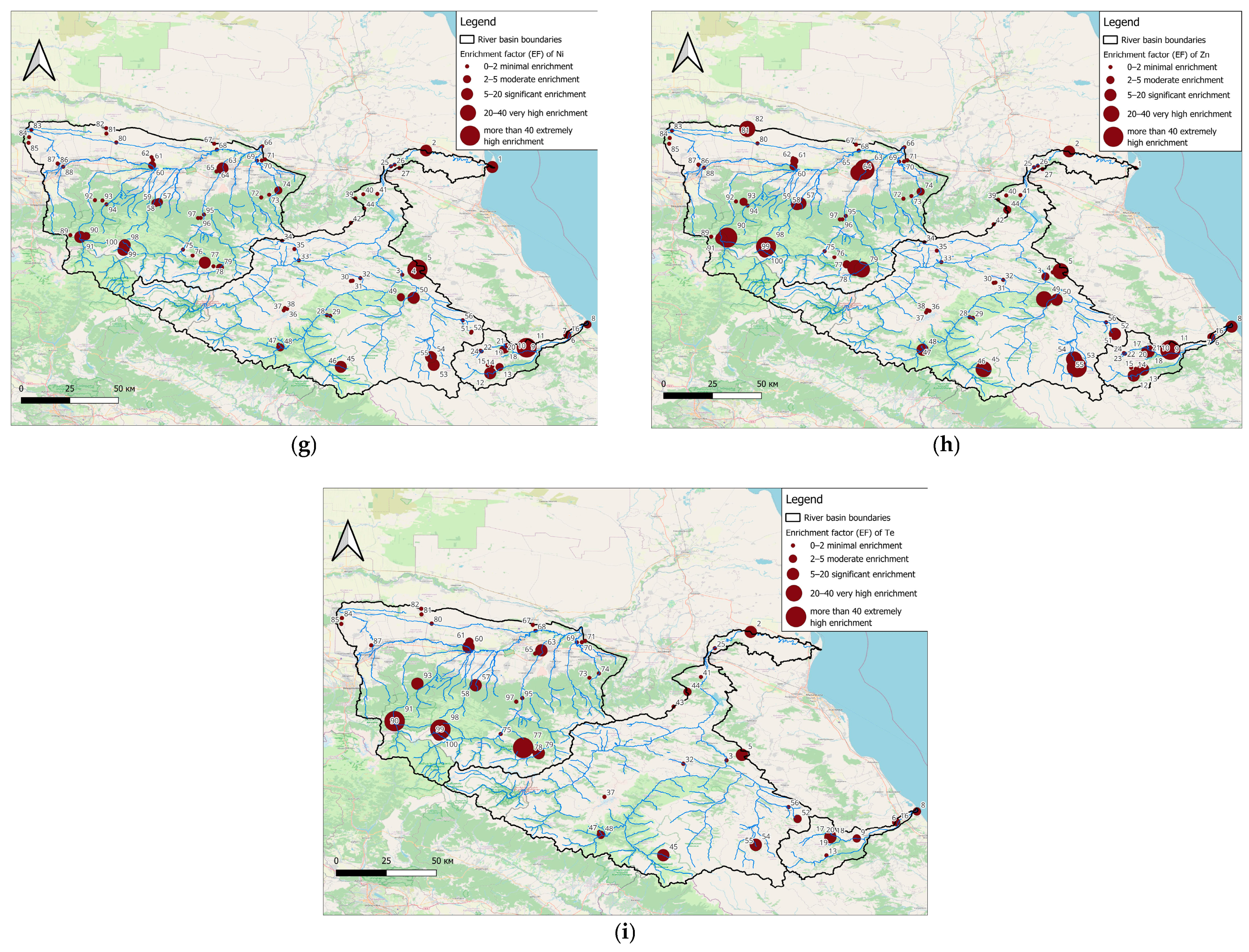 In the Sunzha River Basin, 19 zones with extremely hazardous contamination have been identified. Some of these zones are located in high mountain areas without settlements; however, toxic elements are transported downstream via sediment fluxes. High concentrations of Ni, Cu, Zn, Cr, and Te were detected at nearly all sampling sites. Additionally, Pb, Mg, Mo, Ag, Cd, and Sn concentrations were elevated in the upper reaches of the basin within the high mountain zone.