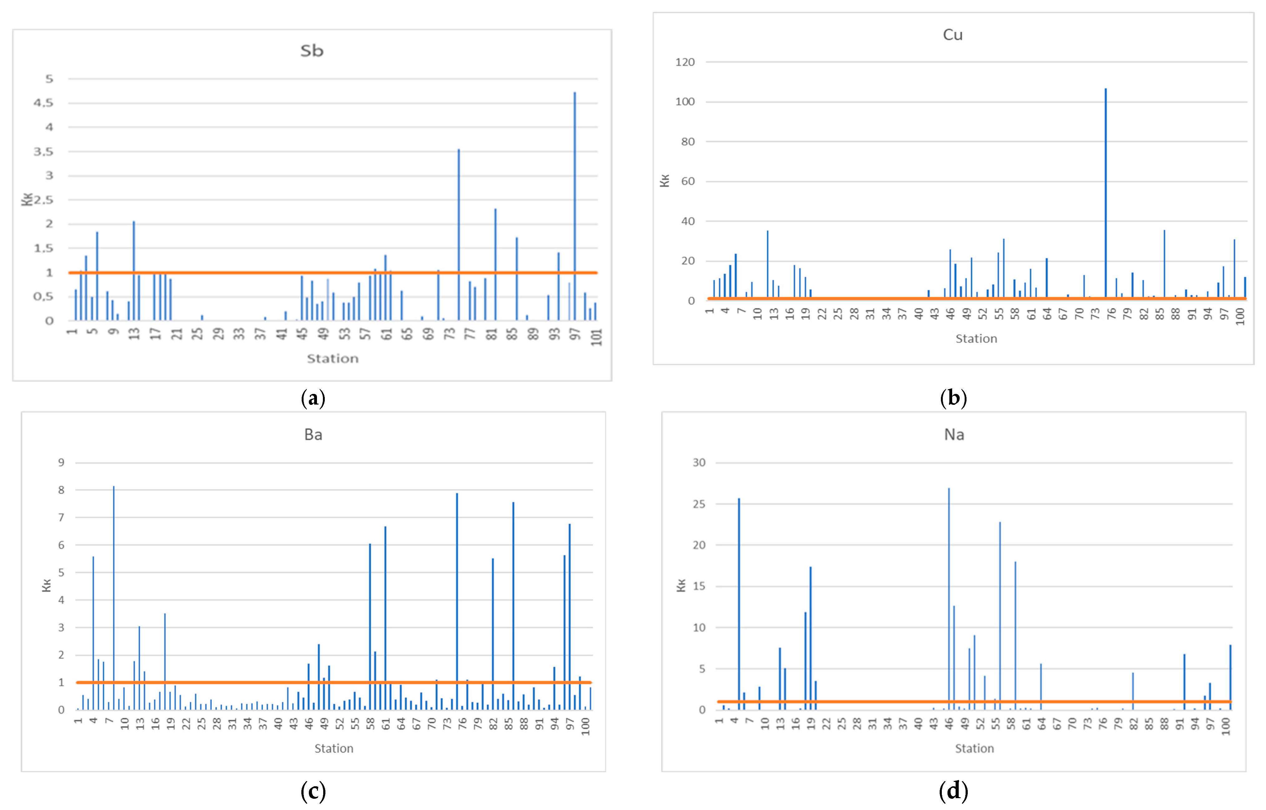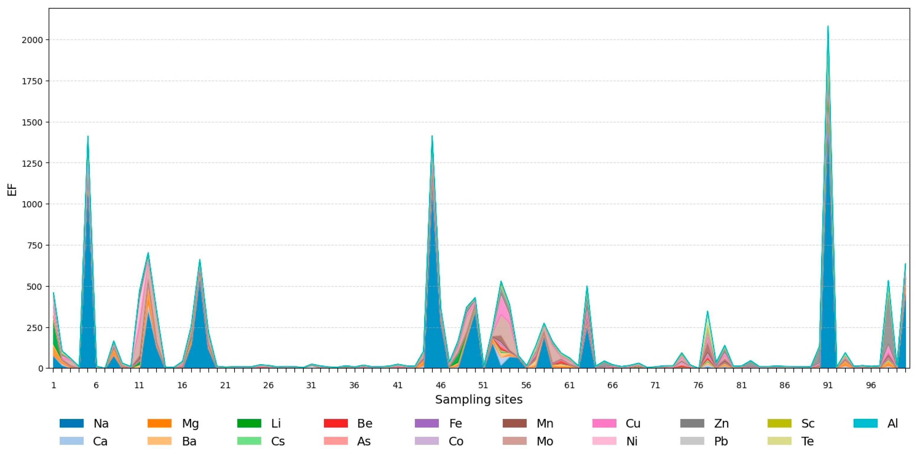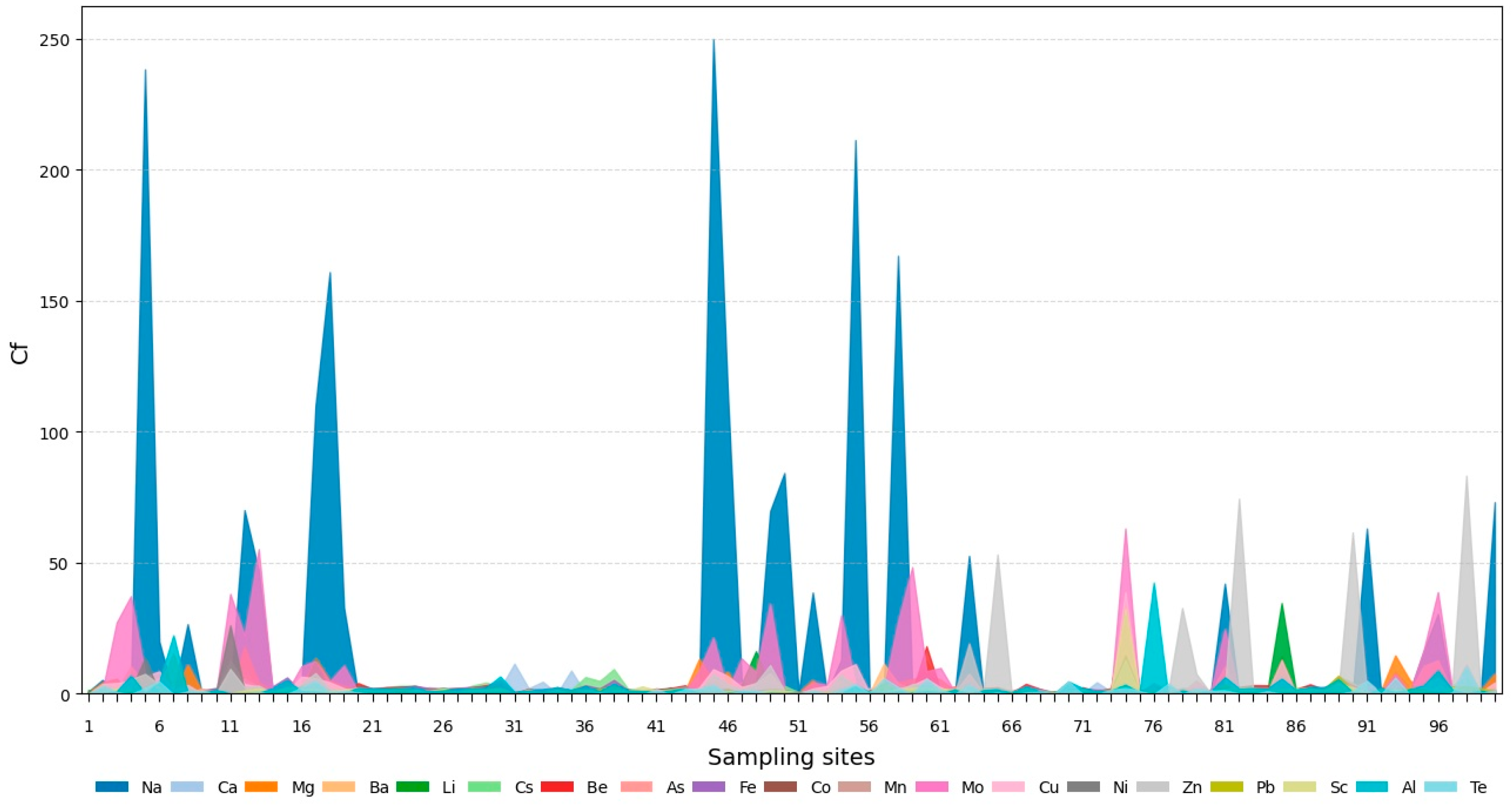 82]. At high values of the enrichment factor (EF), their content is within the regional background, which is also confirmed by low values of the contamination factor (Cf).