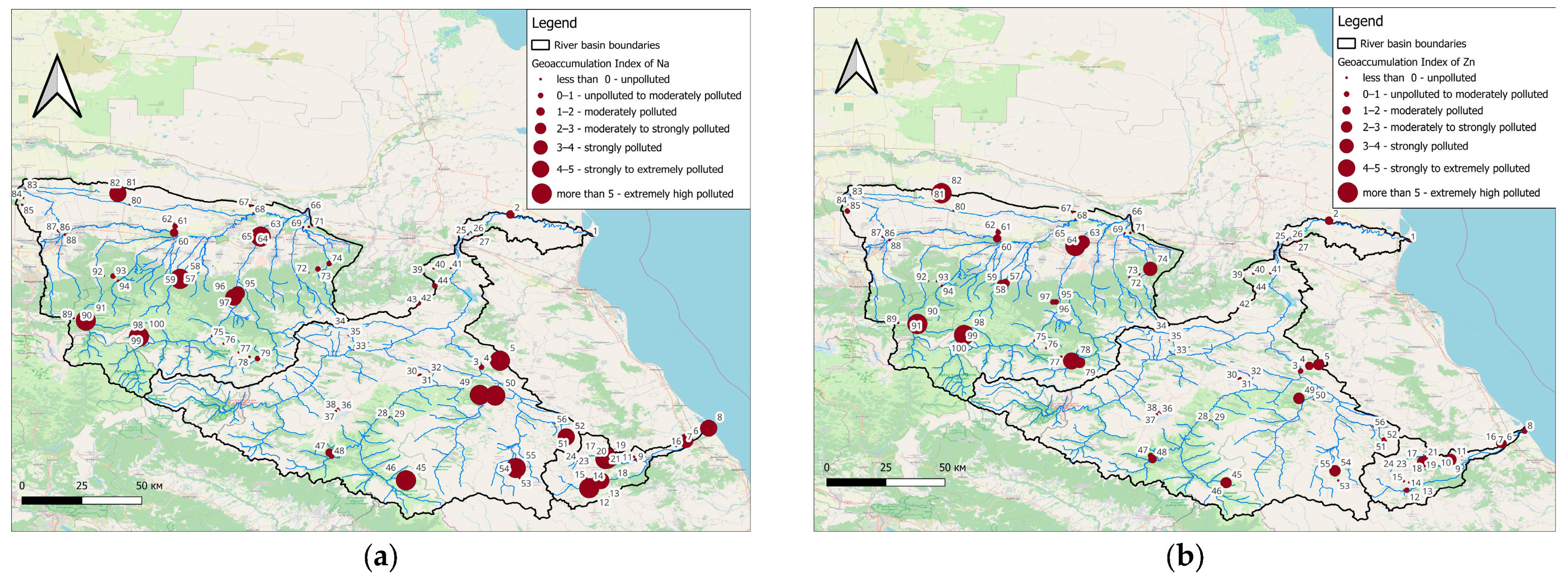 The Sunzha River Basin is adjacent to a major lead–zinc mining region. Within the basin, Zn deposits are also present. Prolonged mining and smelting of Zn in Vladikavkaz (approximately 10 km from the river basin) has led to widespread Zn contamination. Thus, Zn anomalies may be associated with both natural and anthropogenic sources. The anomaly near the city of Grozny exhibits high Zn concentrations throughout the soil profile, suggesting a natural source. In contrast, a second Zn anomaly is enriched only in the topsoil horizon, indicating an anthropogenic input.