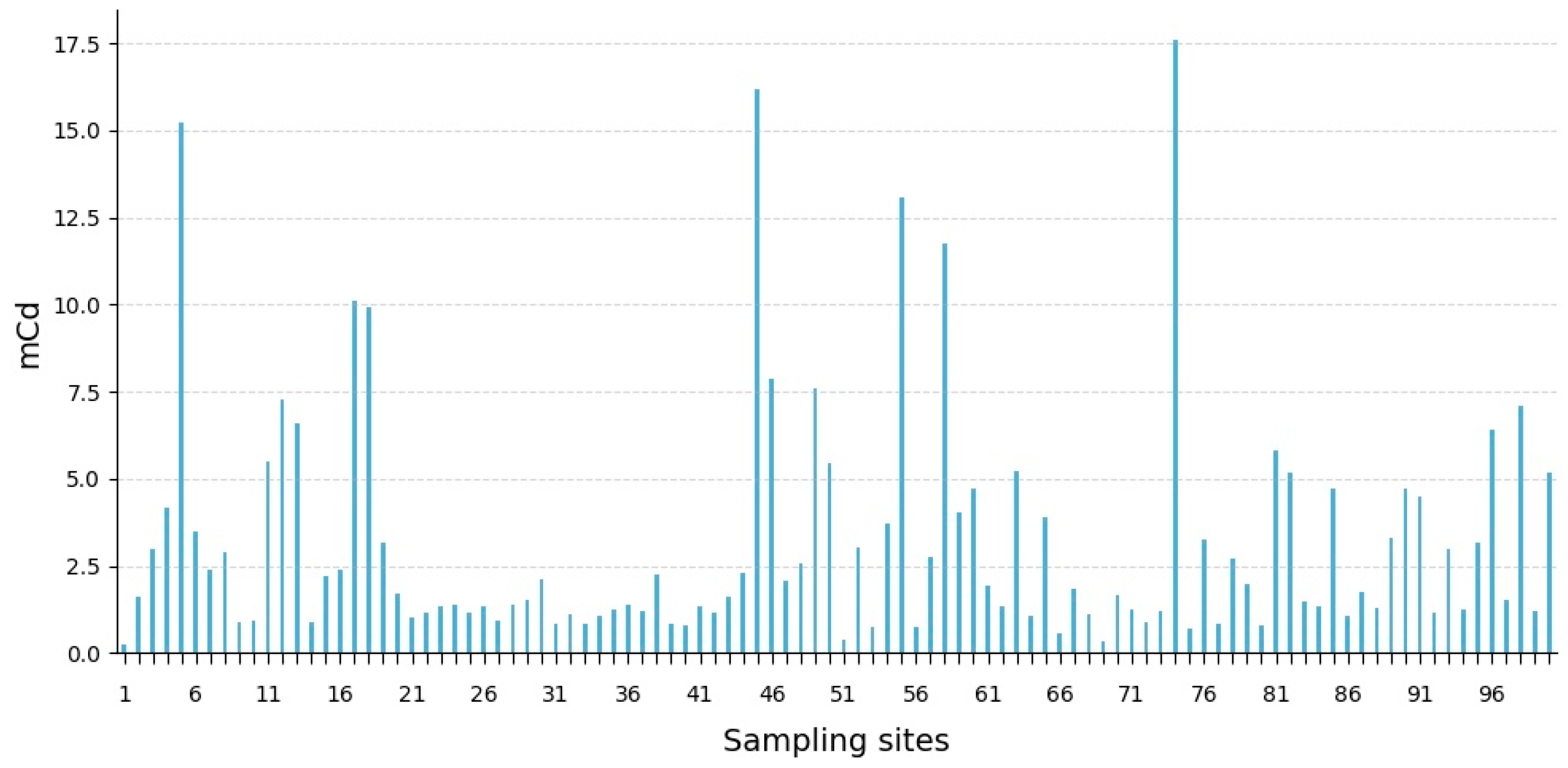 The content of Cd in the upper soil horizons of the Northeastern Caucasus varies considerably due to its high technophilic properties, as well as its deposition on alkaline and sorption barriers. Cd is widely used in agriculture, which is an additional source of its input into the soil. Its concentration reaches 102 mg/kg, which is higher than in many parts of the world [