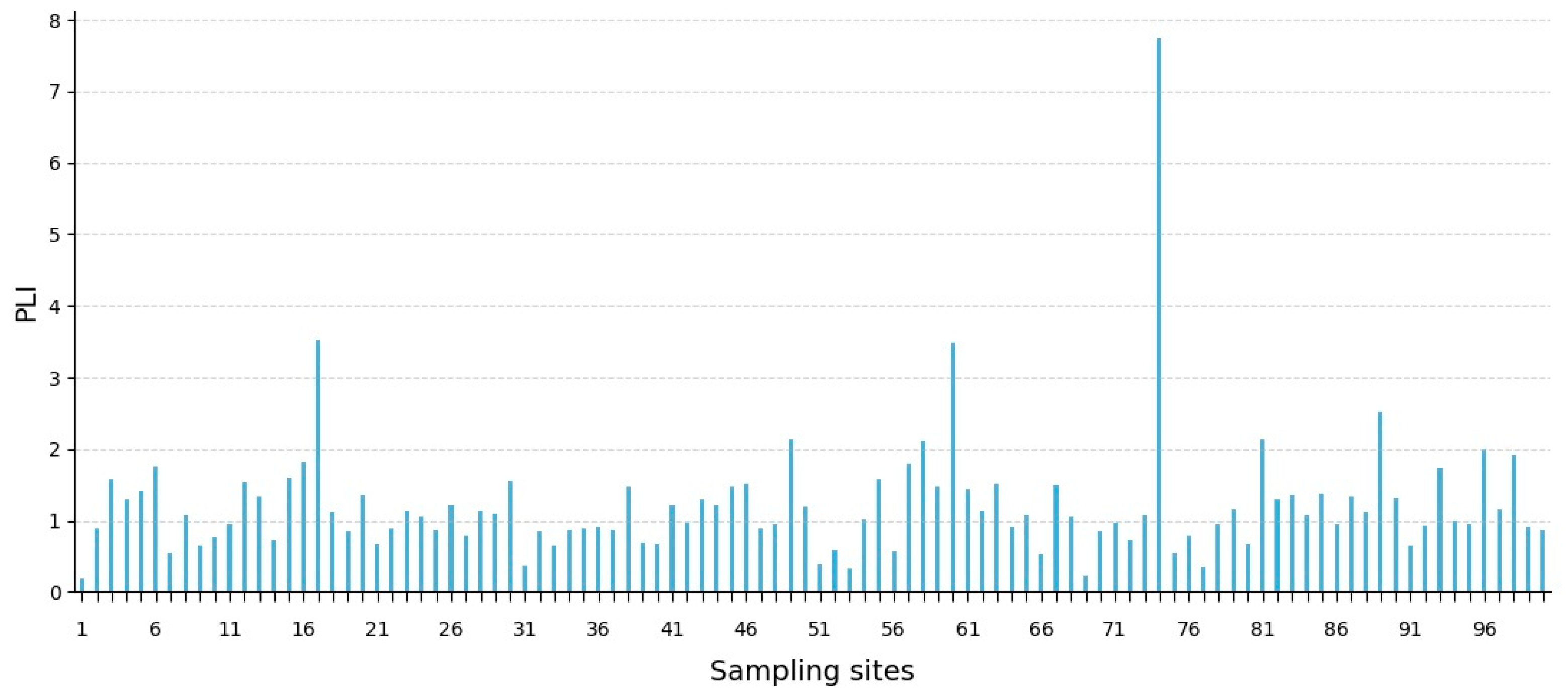 To evaluate the anthropogenic and natural contributions to the formation of contamination hotspots and elevated element concentrations, patterns of variation in the enrichment factor (EF) and pollution indices of Zc and PLI were analyzed.