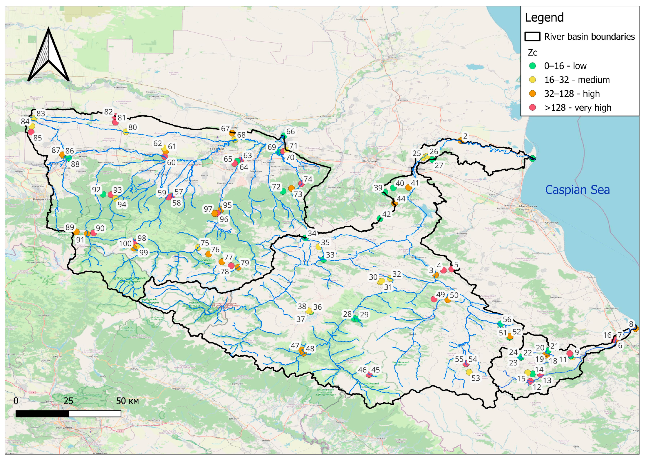 93]. The concentration ratio and accumulation factor of Zn contrast sharply in the river basins—high values in the Ulluchay and Sulak River Basins that increase to extremely high levels by 7–8 times in the Sunzha River Basin. In the basins of the tributaries of the Sulak River—the Avar Koisu and the Andi Koisu—the Zn content is minimal.