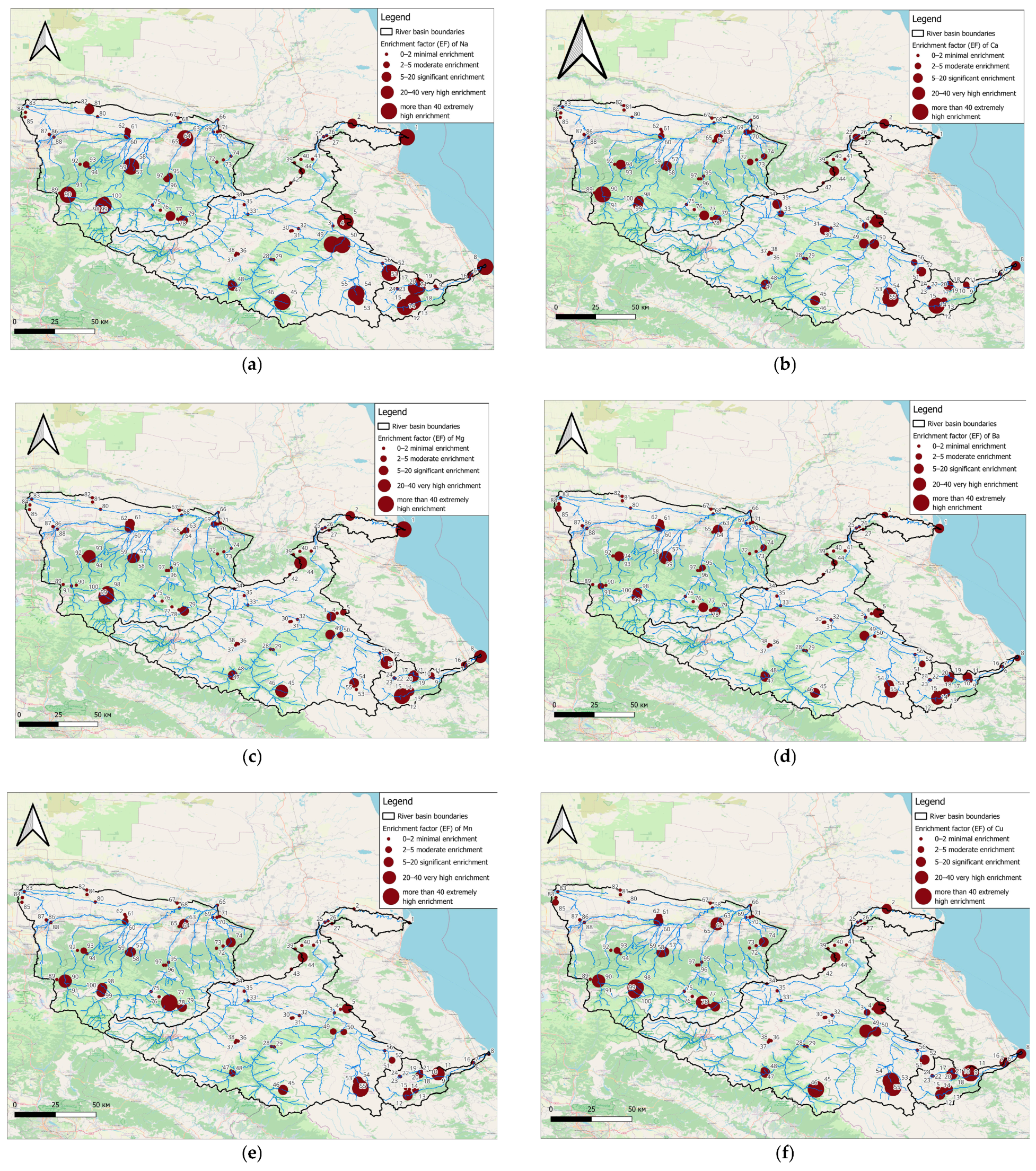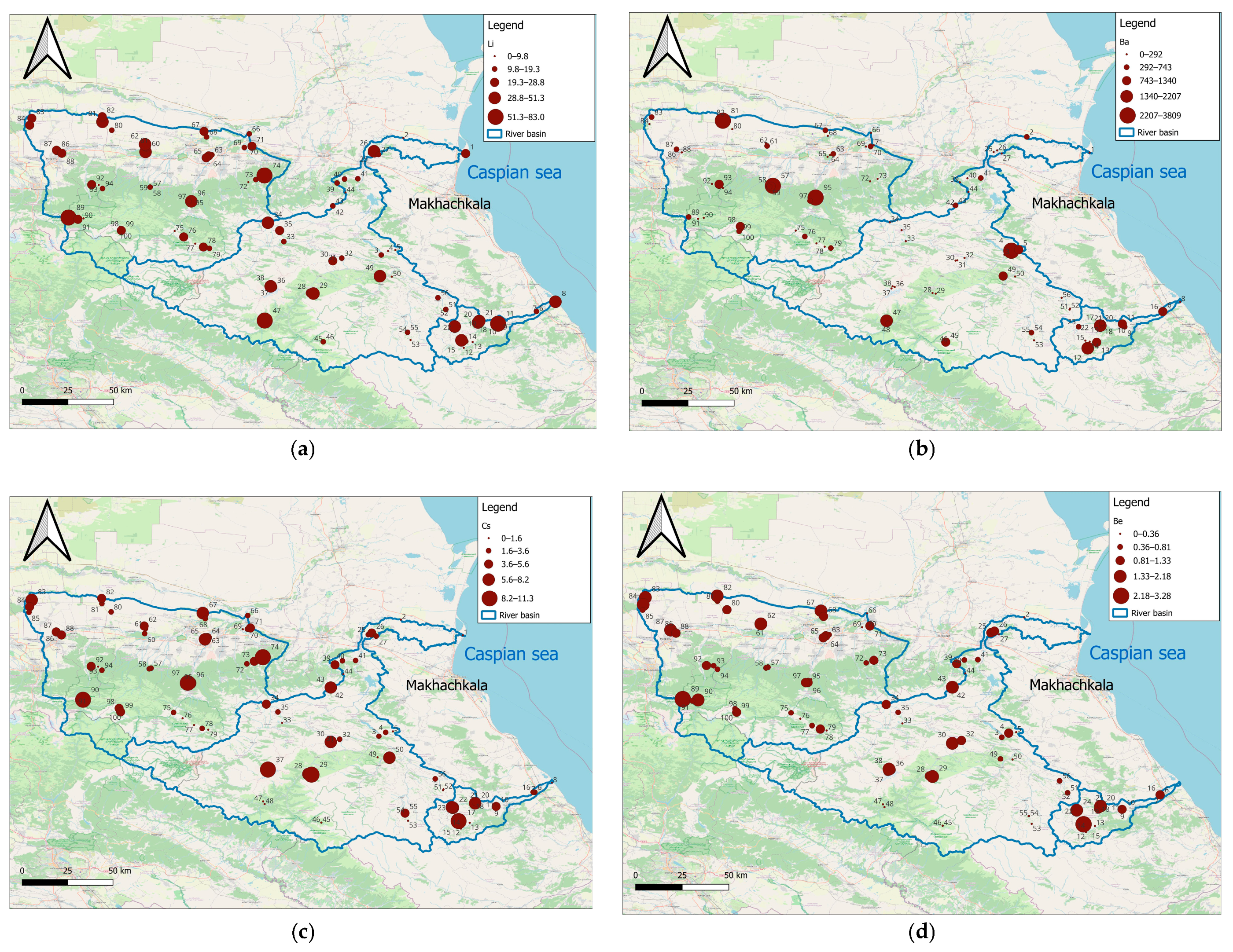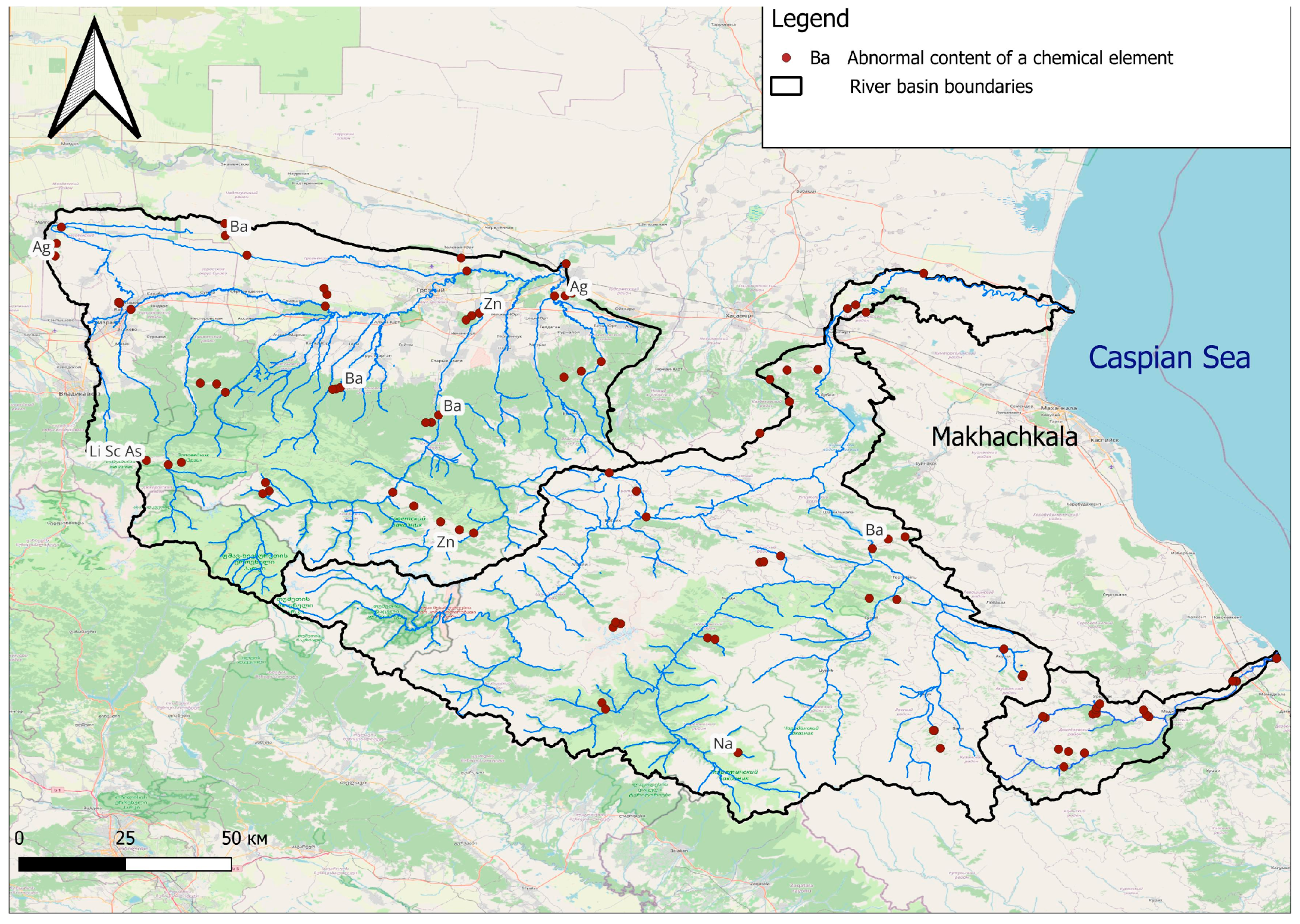 87]. The diversity of lithology and complexity of the history of geological development of the territory determine the possibility of finding Li in the basins of rivers of the Northeast Caucasus of different origin: in argillaceous rocks of the foothills, in deposits of the highlands, and in the evaporation of salt deposits on the plains. Li forms one anomaly, which is represented in the Sunzha River Basin.