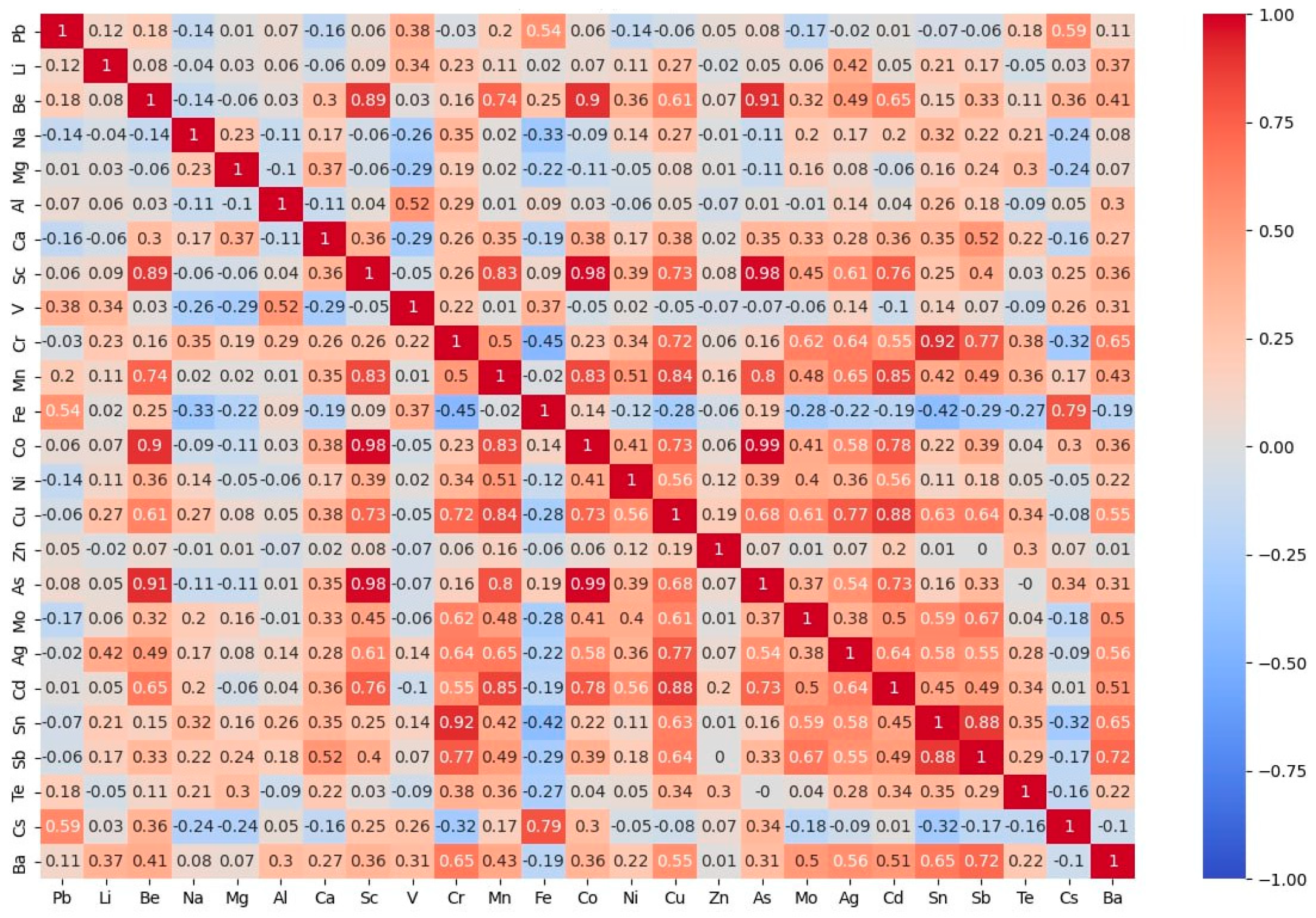 Sb and Sn are distinguished by their very low presence, often below the sensitivity level of chemical–analytical equipment.