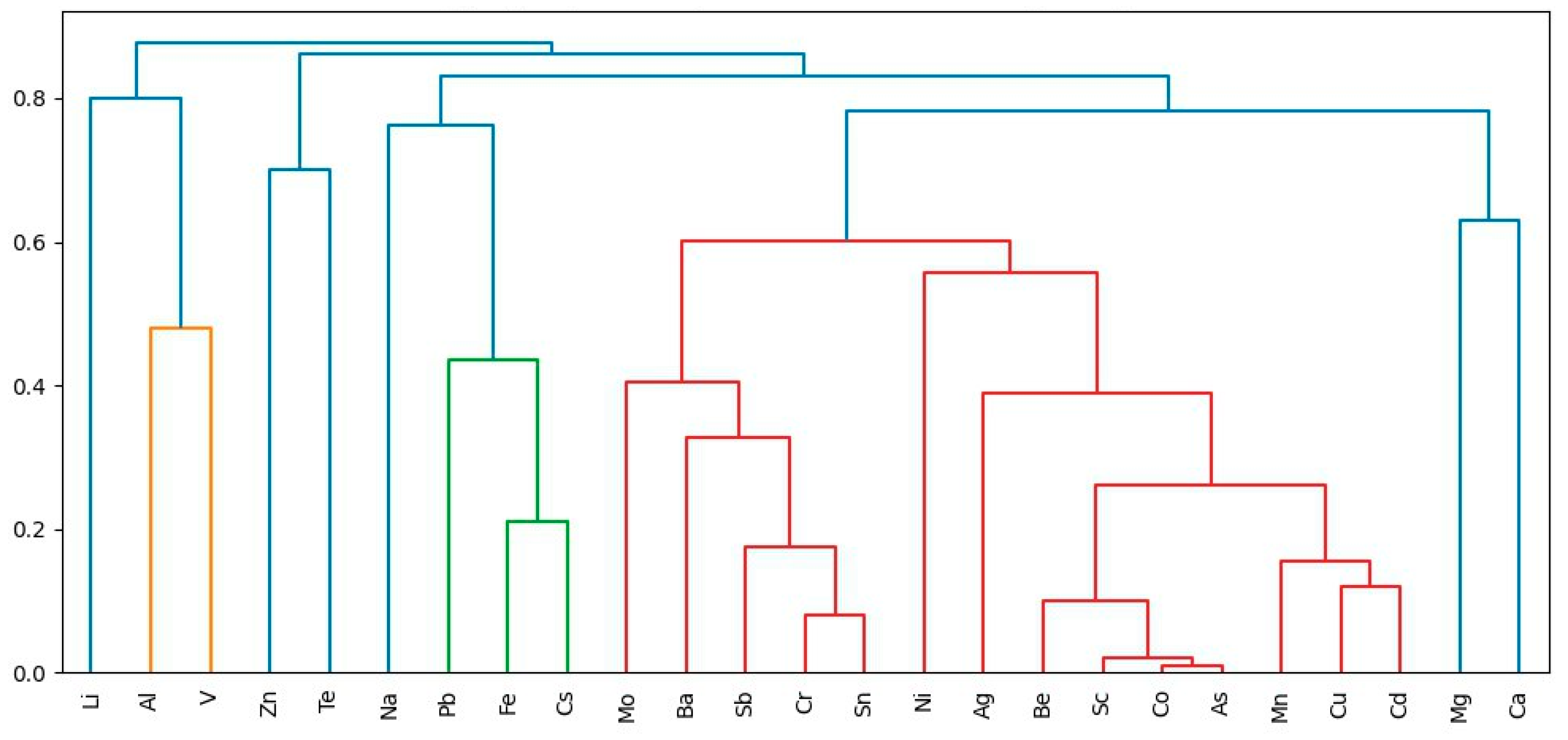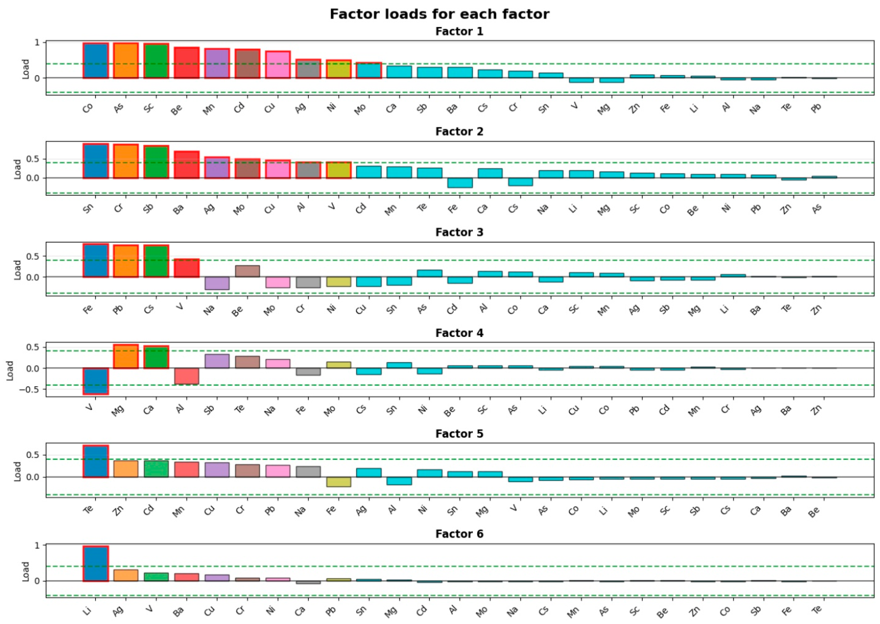 Factor 1 was dominated by Co (98.00%), As (97.40%), Sc (95.60%), Be (85.40%), Mn (82.20%), Cd (97.90%), and Cu (74.60%), which accounted for 37.20% of the total variance. The similar distribution patterns of these chemical elements are confirmed by their mutual clustering in correlation analysis. These metals are likely to be contributed by lithogenic processes such as soil erosion and rock weathering.