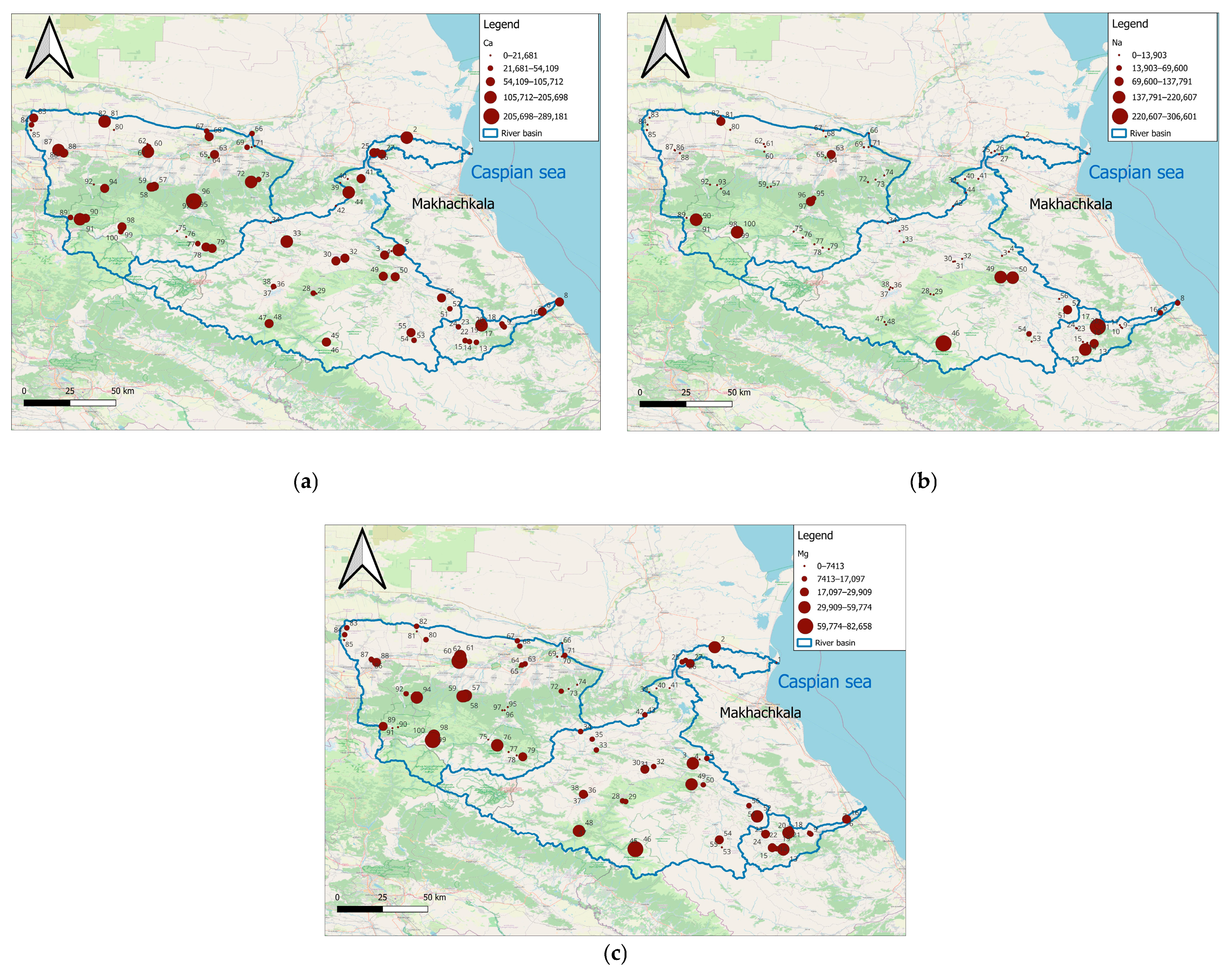 Mg and Na contents relative to Clarke values and regional background show similar trends: increased concentrations in the lower parts of the Ulluchay and Sulak rivers, the middle reaches of the Sulak River between Kizilyurt and Urus-Martan, and the highlands of the Sunzha River Basin. In the upper reaches of the Ulluchay River and the northeastern part of the Sulak River, concentrations of Na and Mg relative to the Clarke and regional background decrease sharply. In the coastal strip of the Caspian Sea, the increased content of Na and Mg is caused by the influence of sea salt. The salinization of soils formed on terrigenous–carbonate deposits of the Dagestan plain increases when moving from upper hypsometric levels to lower ones along the landscape–geochemical catena with increasing salinization [