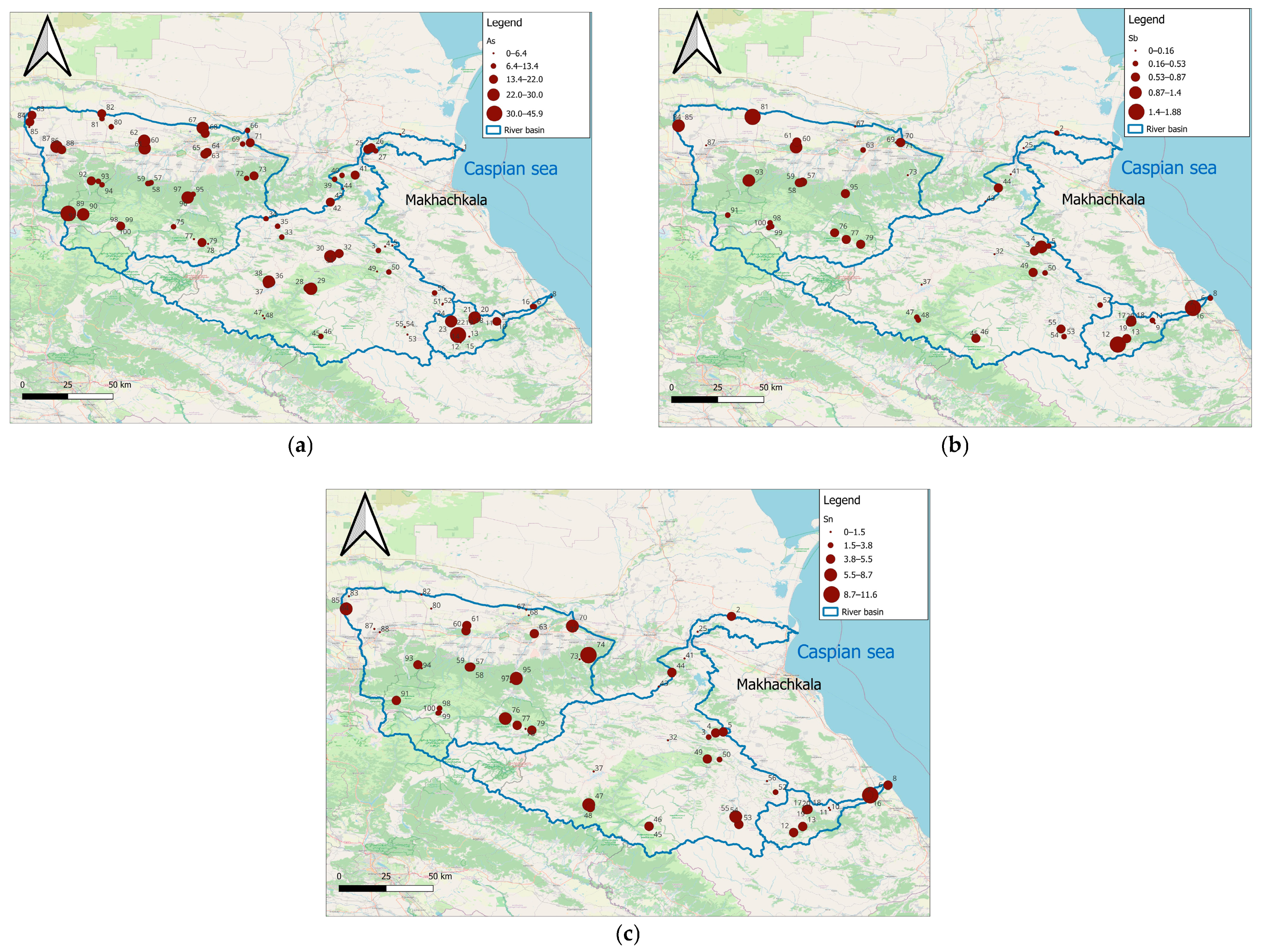 93]. The element often settles on carbonate geochemical barriers. There is a slightly reduced (to Cf = 0.5) content of As in the coastal zone in the basin of the inflow of the Sulak River—the river Kara-Koisu. Geologically, the zone is composed of dense Upper and Middle Jurassic igneous rocks. Anthropogenic sources of As include agriculture and forestry, where arsenic compounds are applied as pesticides.