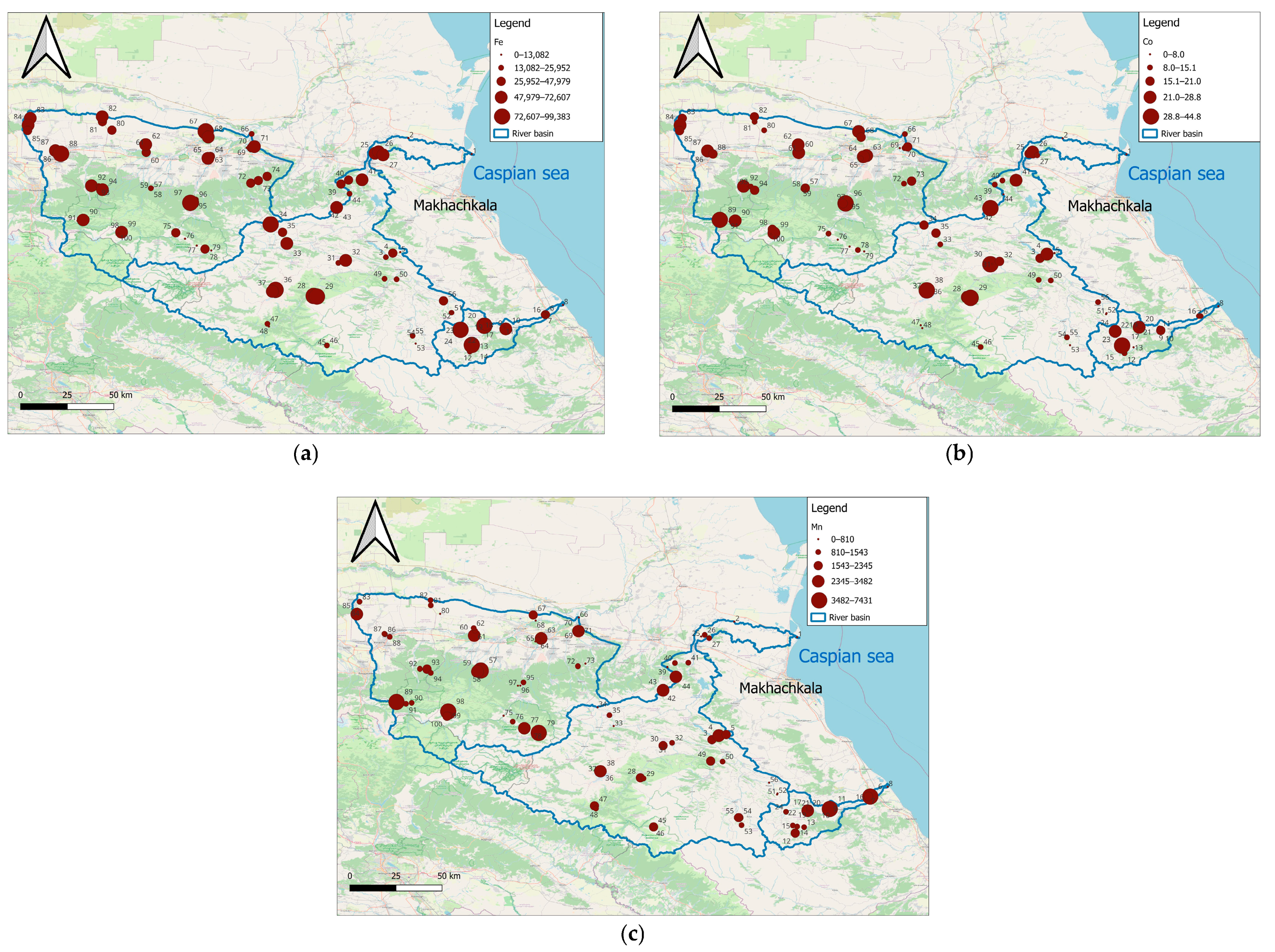 Mn is characterized by polyvalence, high biodiversity, and high biogenic accumulation in soils, which determines the exceedance of its content in the upper soil horizons of the Northeastern Caucasus above the Clarke in the lithosphere. The Mn content is slightly higher in the basin of the Sunzha River compared to the basins of the Sulak and Ulluchay Rivers.