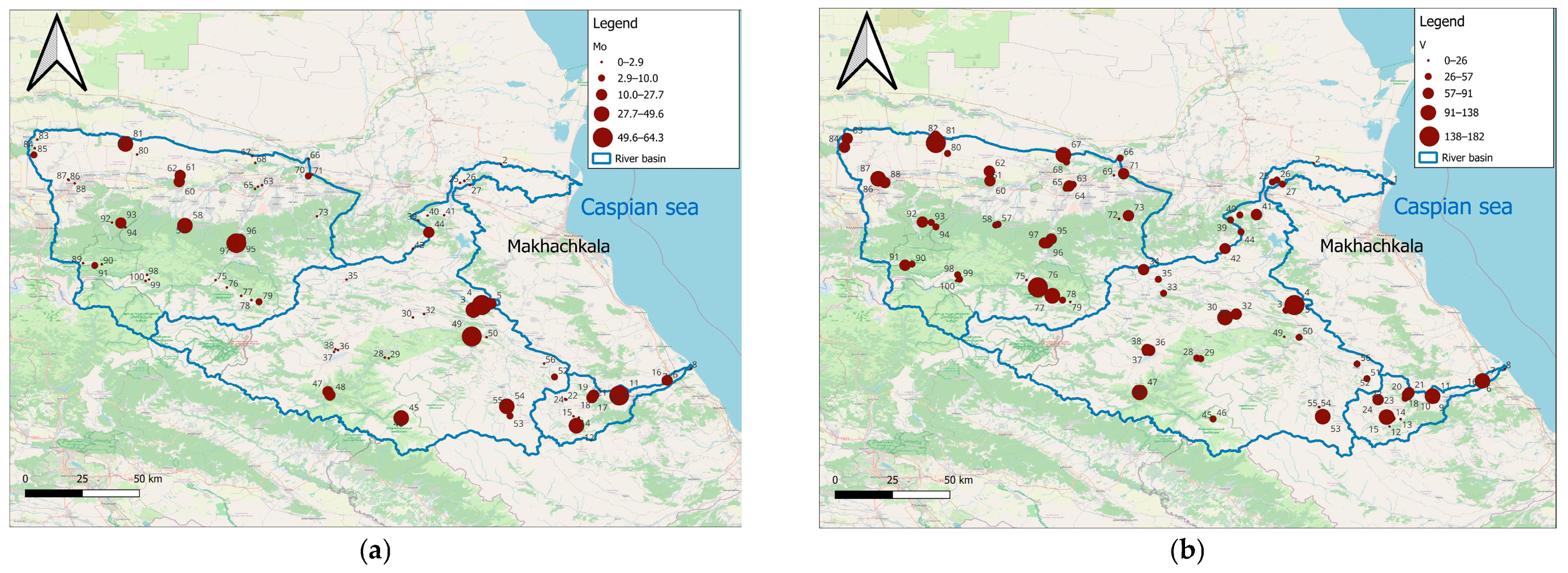 The high Cr content at many sampling sites may be due to the composition of the rocks, as well as the high role of mechanical migration in the distribution of the element throughout the landscape. It often significantly exceeds the content of the Clarke in the lithosphere with well-defined accumulation areas: the lower reaches of the Ulluchay and Sulak River Basins, and in the high, mountainous part of the tributaries of the Sulak River. Concentrations of Cr drop sharply in the northwestern part of the Ulluchay Basin and in the Andi Koisu and Avar Koisu Basins. Compared with material data [