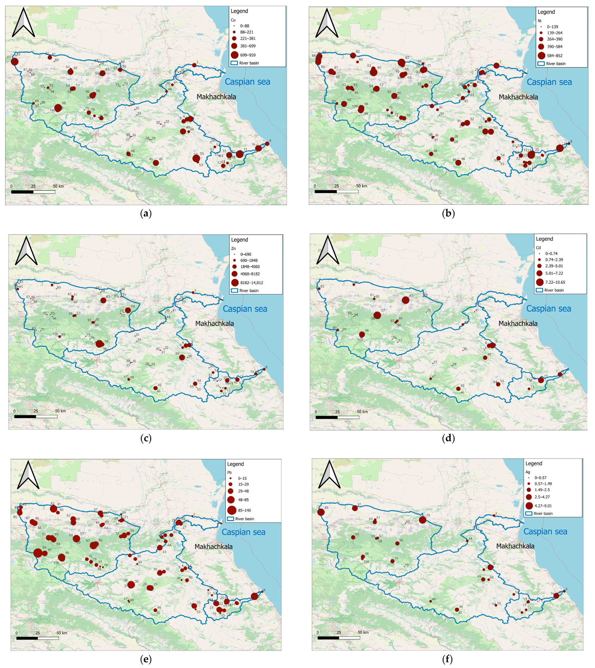 Two Ag anomalies were identified within the Sunzha River Basin near the urbanized areas of Grozny, Gudermes, and Argun and on the slope of the Sunzhensky Ridge. In the urbanized area, Ag concentrations in the topsoil horizon are several times higher than in the underlying horizons: 7.939 mg/kg (A 3–41 cm), 1.535 mg/kg (B 41–70 cm), and 1.136 mg/kg (C 70–82 cm).