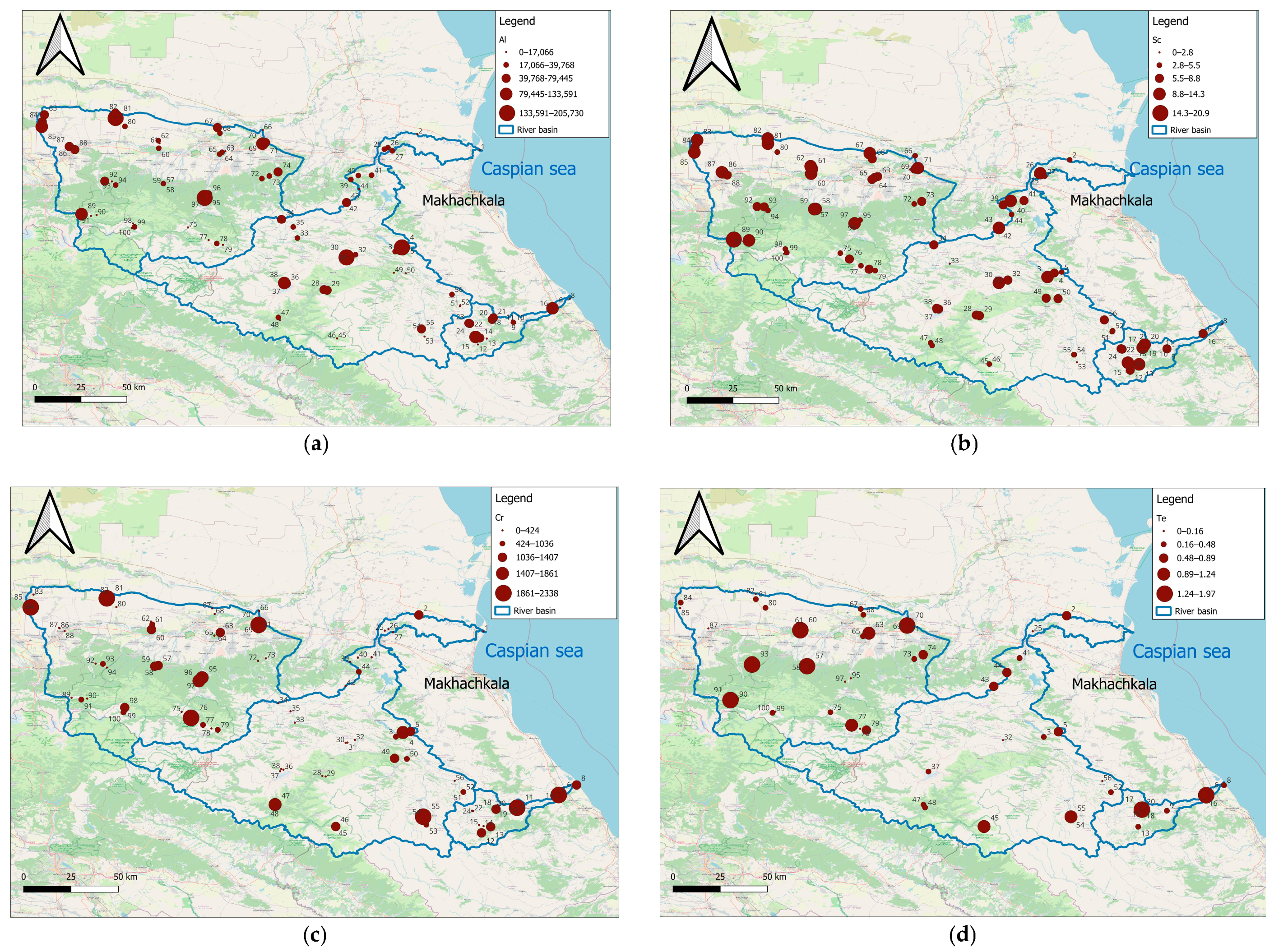 In the Sulak River Basin, soils with extremely hazardous contamination are concentrated in the eastern part, along the right tributary of the main river—the Kara-Koisu River. Here, soils are contaminated with Cr, Cu, Zn, Mo, Ag, Te, Cd, Na, and Ni. These elements are highly toxic and exert adverse effects on human health.